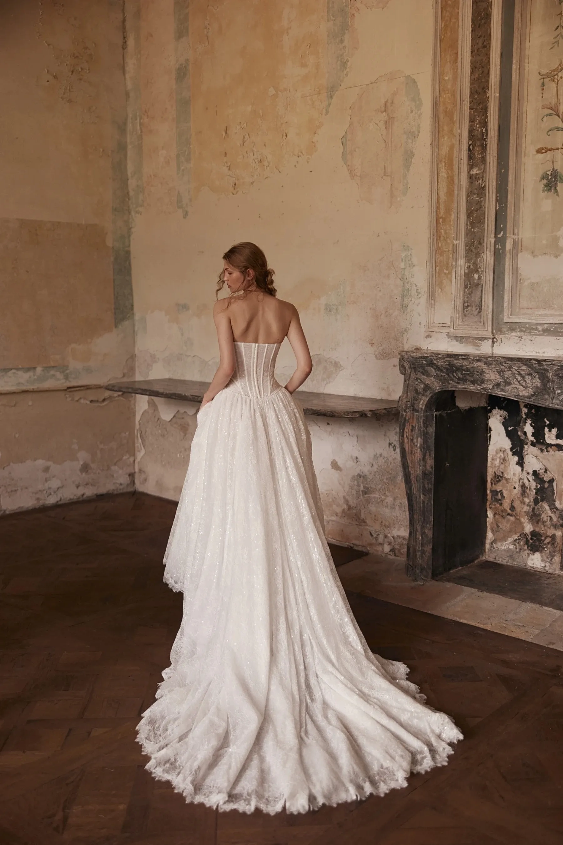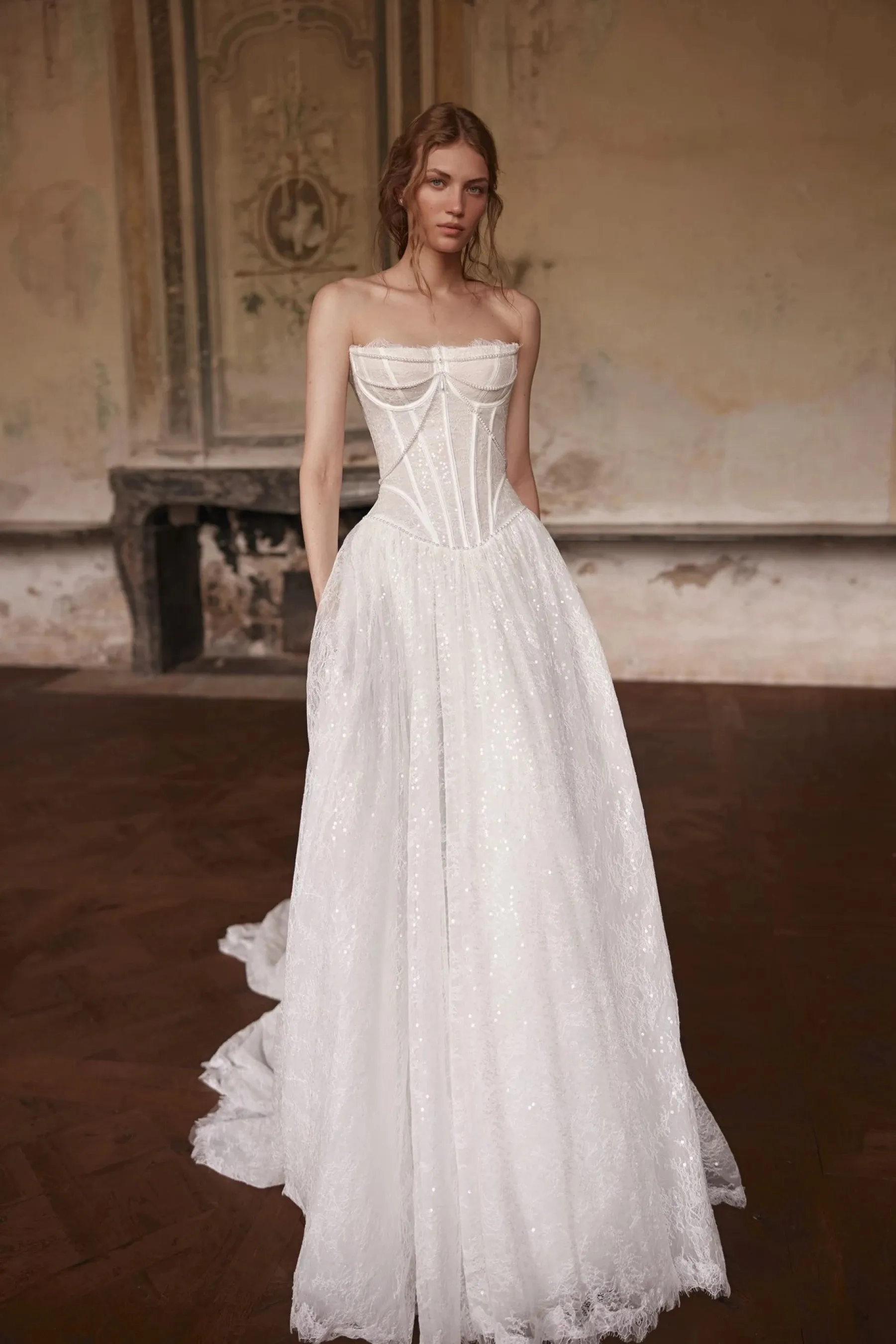 A charming A-line gown in ivory – the embodiment of sophistication, romance and sparkle that envelops the bride like light. Crafted from luxurious lace with delicate sequin shimmer, it softly glistens with every movement, creating a sense of fairytale radiance. The elongated semi-sheer corset with a shaped neckline and molded cups perfectly accentuates the décolletage and waistline. The bodice is adorned with lace scalloping that elegantly emphasizes the contours, while hand-embroidered pearls combined with milky-hued satin ribbons lend the piece an exquisite accent and multi-layered texture. The back is gently curved, and the closure features hook-and-eye extenders, ensuring a secure and comfortable fit. The model is also available in light skin version, and optionally with a lined skirt for a more modest look.
