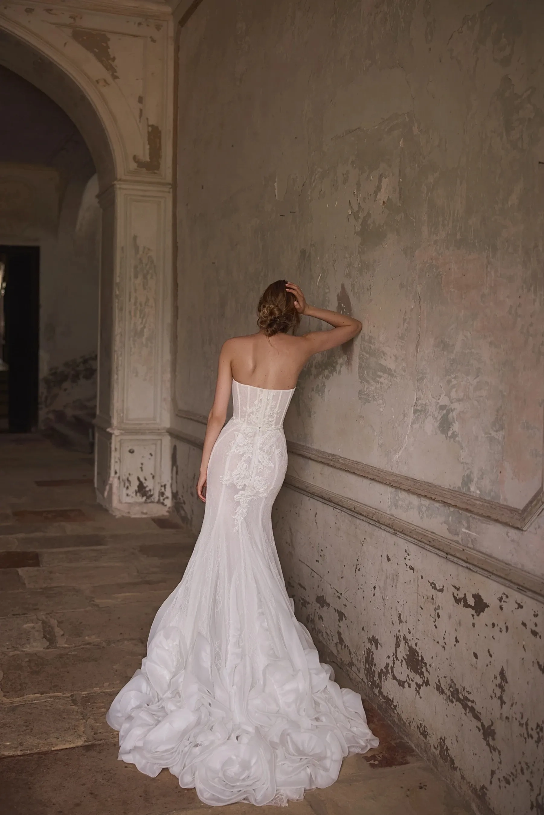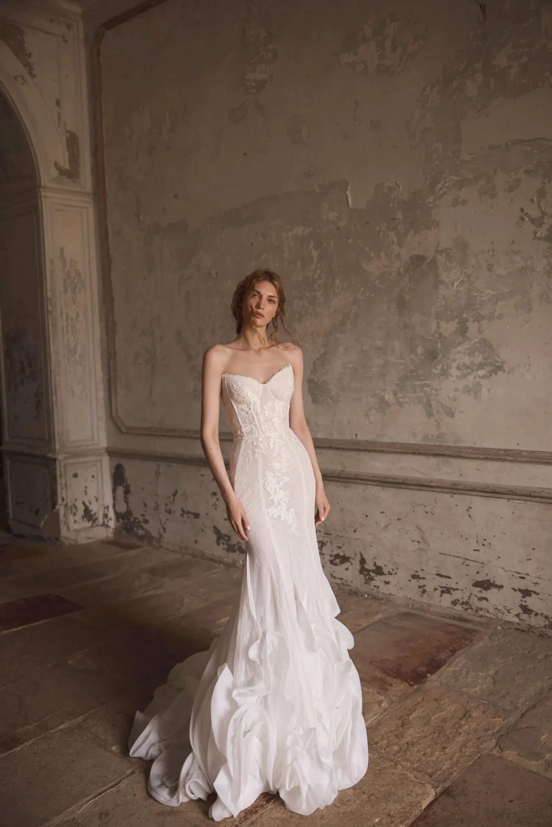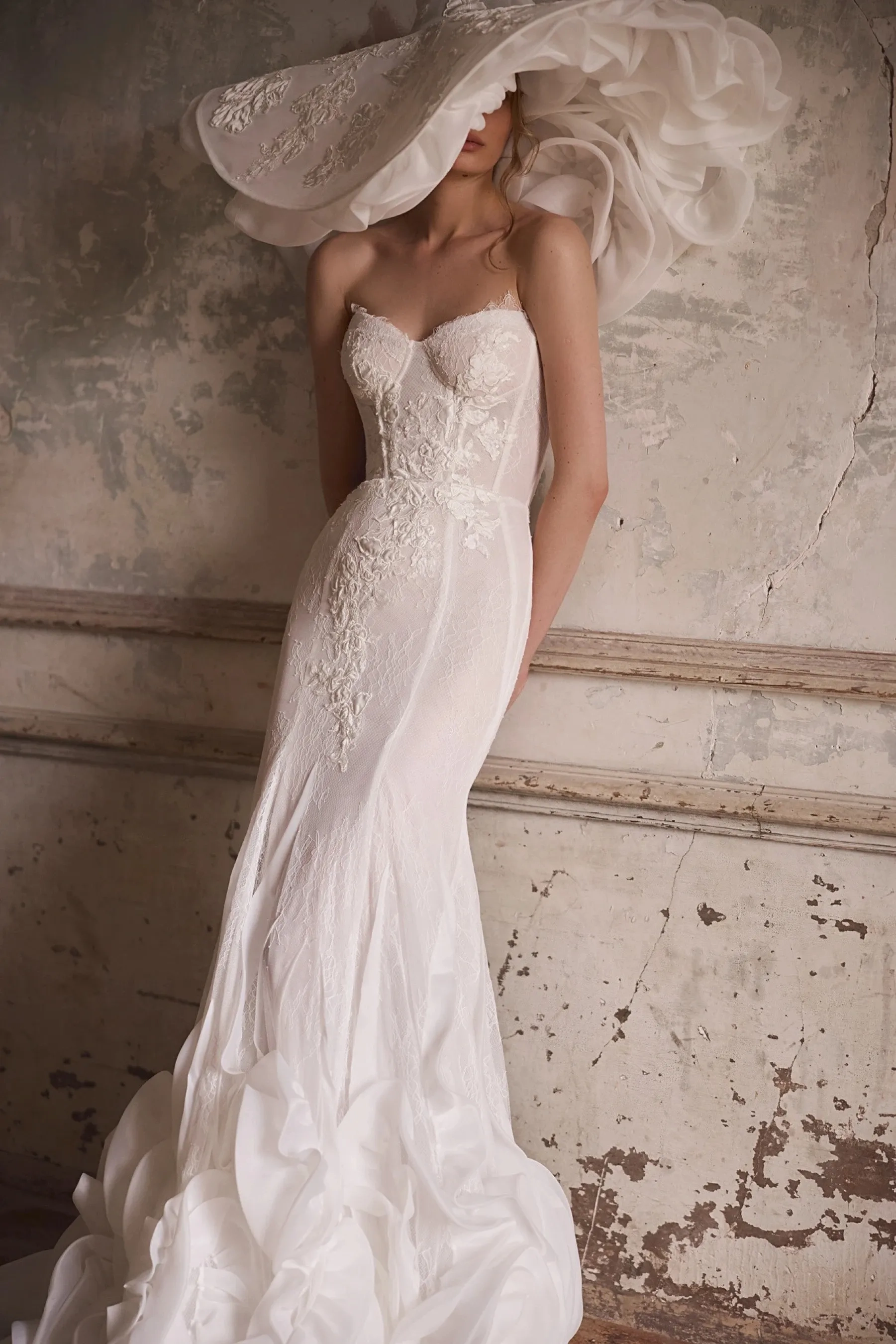 An exquisite mermaid silhouette gown in ivory – the epitome of femininity and refinement. The corset, crafted from delicate lace, accentuates the elegant lines of the figure, while the romantic sweetheart neckline flows smoothly into lace scalloping, adding a touch of elegance to the look. The corset back features a sensual curved shape, and the hook-and-eye extender closure ensures a comfortable fit. The fitted lace skirt gracefully hugs the figure, emphasizing the silhouette, and flows smoothly into a train, creating a gentle wave effect with every step. Shaped organza ruffles adorning the skirt add special dynamics and volume, lending it expressiveness and charm. The skirt closure is a hidden zipper. The gown is also available in light skin color and with lining. The look can be complemented with an elegant hat adorned with shaped organza ruffles and lace – the perfect finishing touch for a stylish bride who values exclusivity of details.
