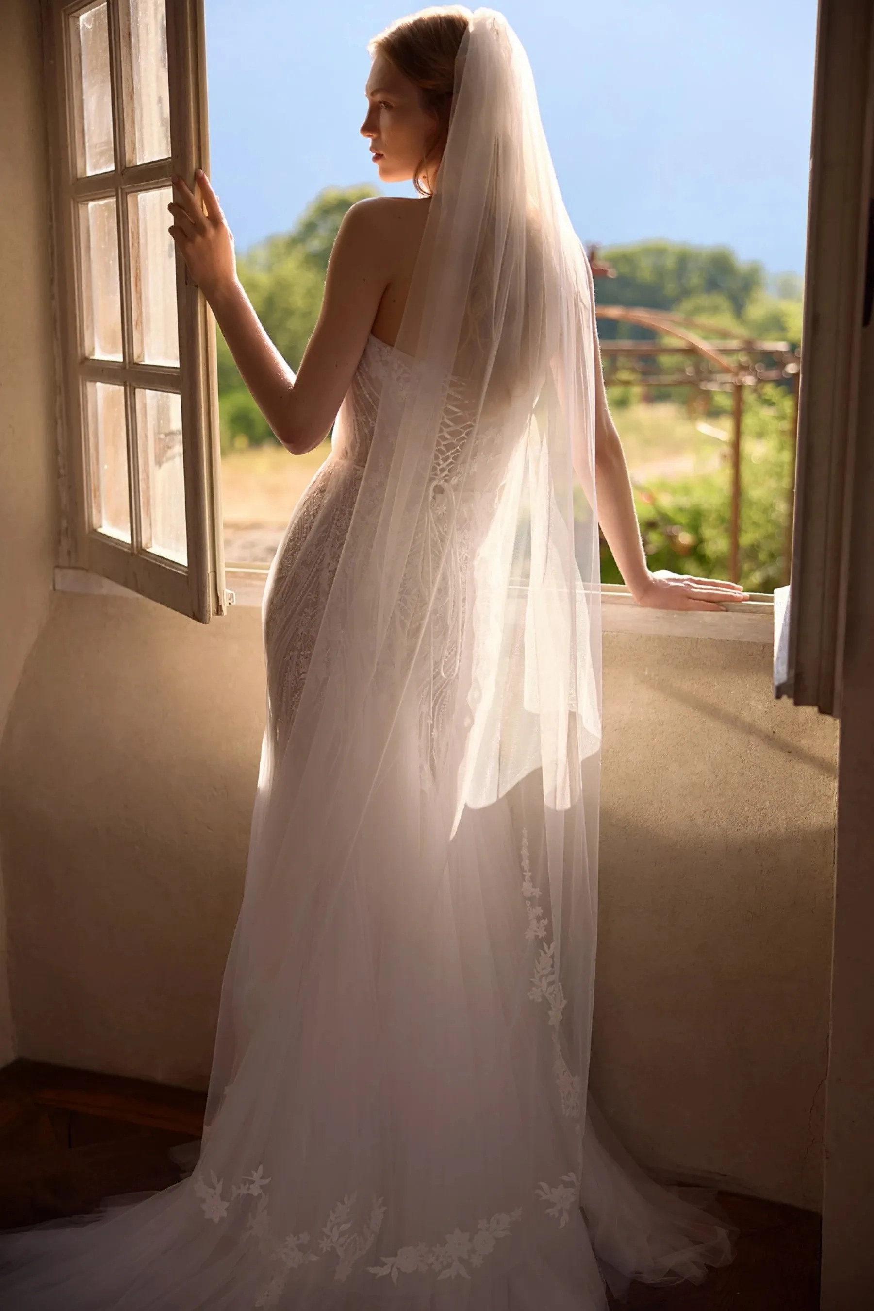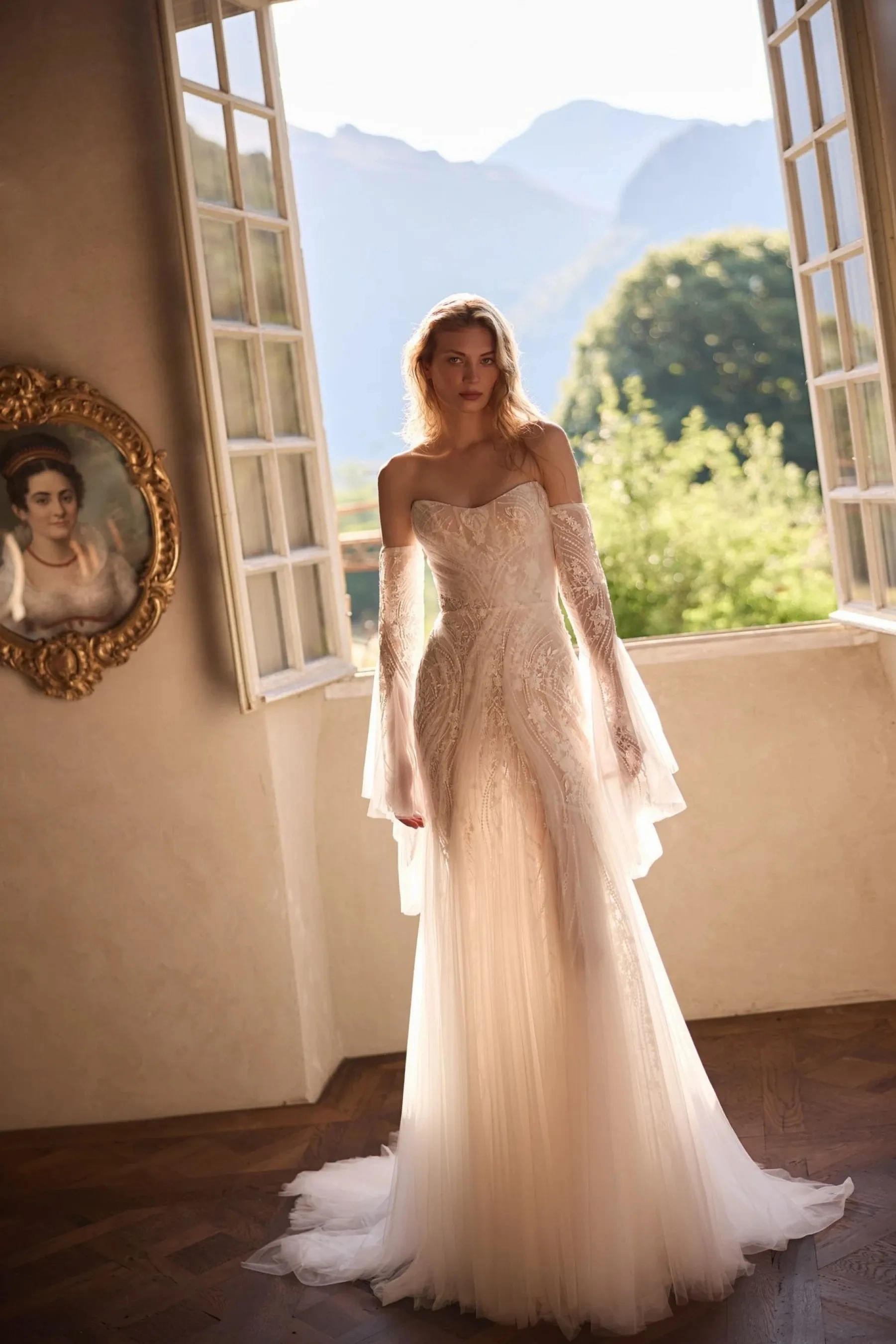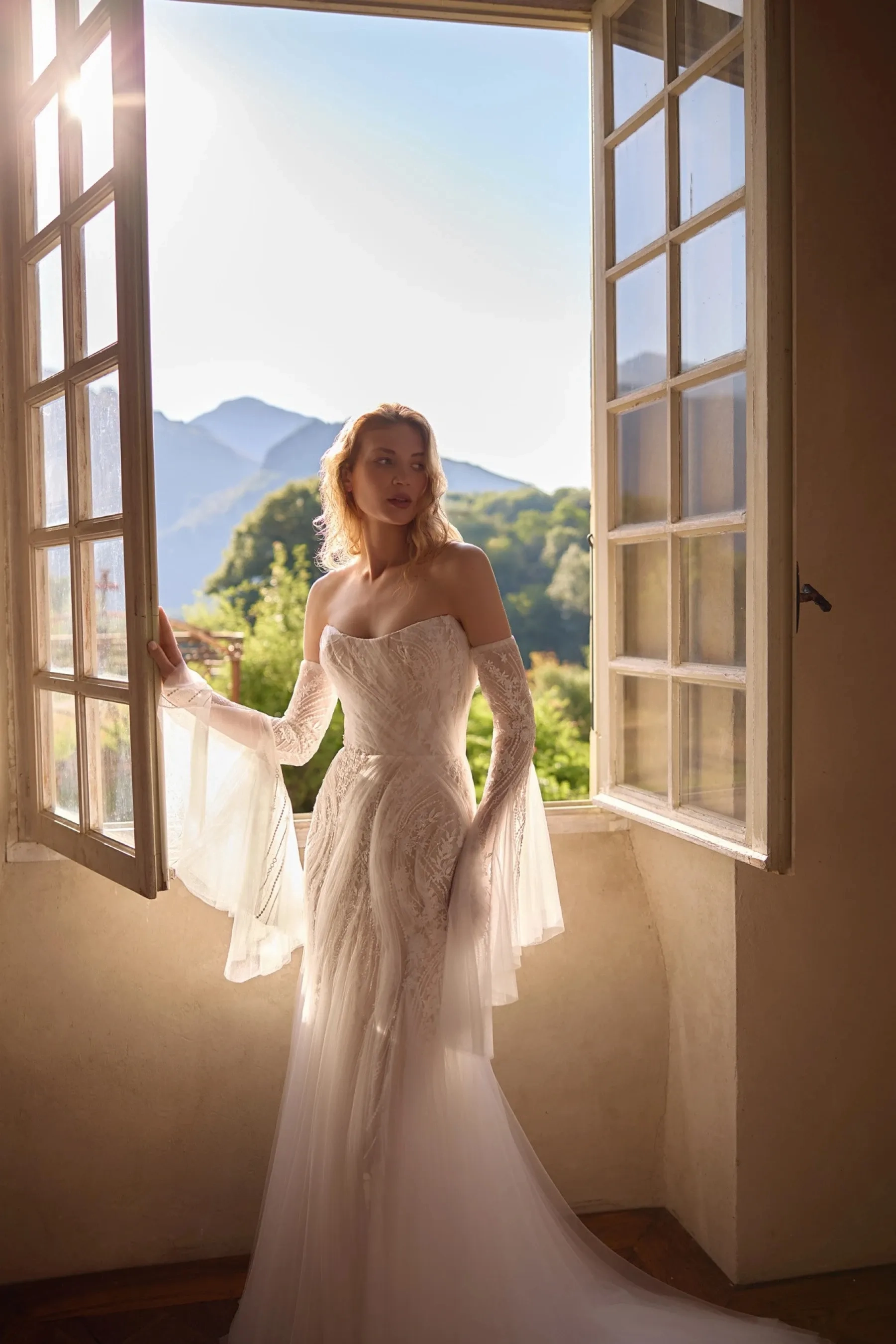 A sensual mermaid silhouette wedding gown in light skin shade impresses with its elegance and refined design. The semi-sheer corset with an elegant boat neckline gently emphasizes the shoulder line, creating a delicate yet bold accent. The closure with loops and lacing at the center back is not only functional but also accentuates the waistline, lending sophistication to the look. The fitted skirt hugs the figure in the hip area, gracefully emphasizing the mermaid silhouette. In the lower part, it opens thanks to panels of airy tulle that create an effect of lightness and fluid movement. A hidden zipper is neatly sewn into the back, keeping the construction seamless and flawless. Special charm is added by tulle draping that softly envelops the silhouette and creates voluminous, airy accents. The model is also available in classic ivory color, and optionally with lining in the skirt. The look can be completed with detachable lace sleeves with tulle panels – a refined detail that offers additional transformation in the bride's style.
