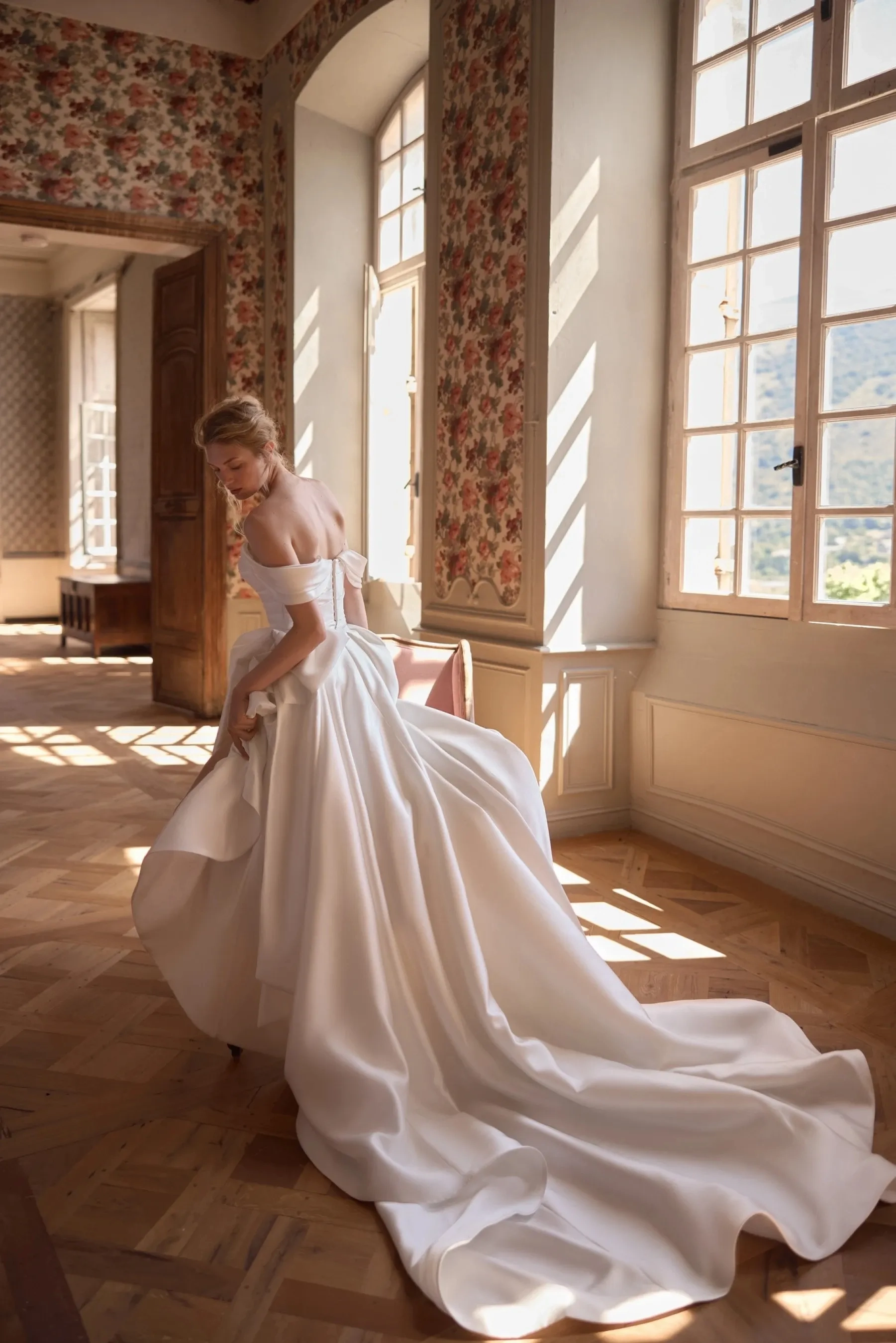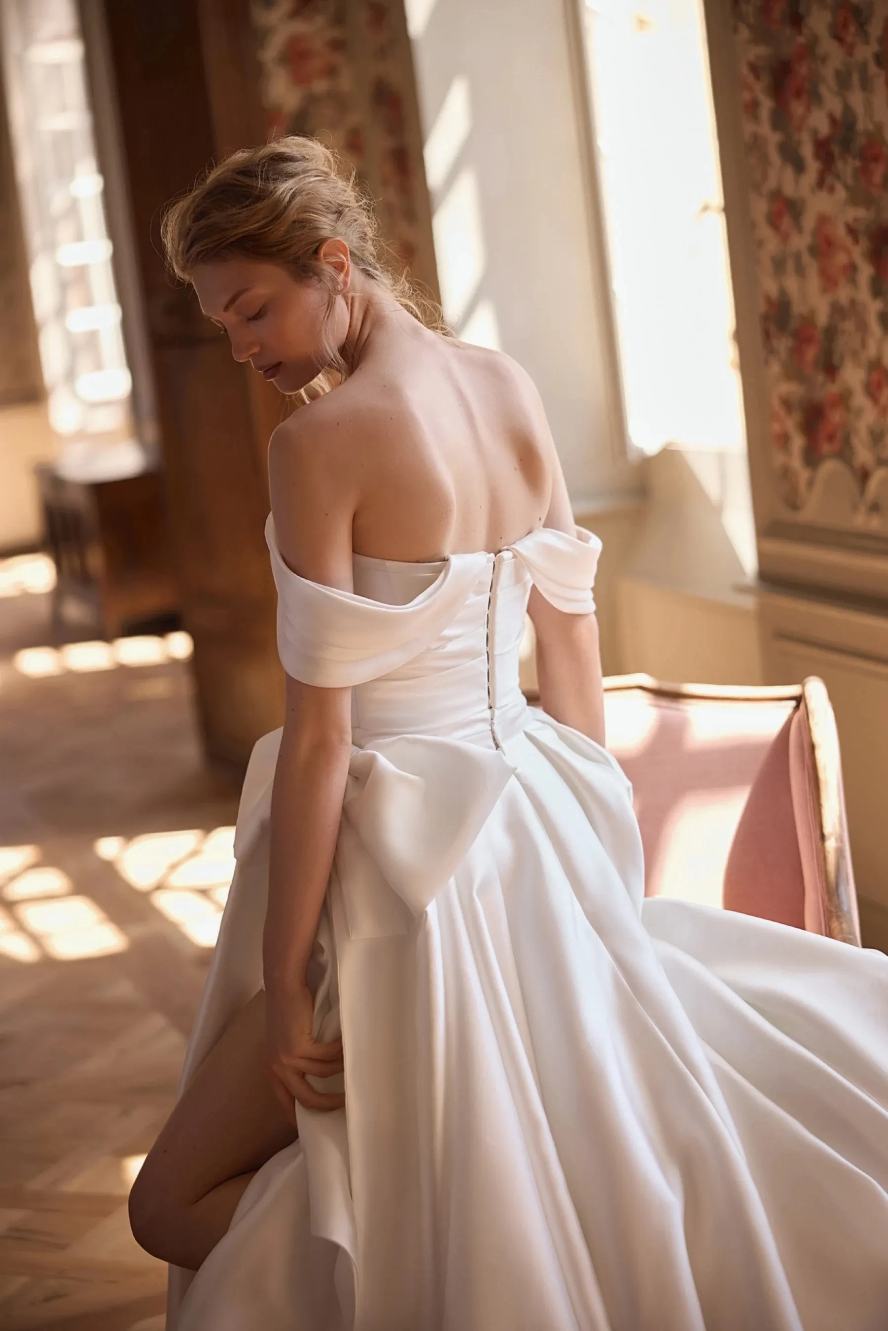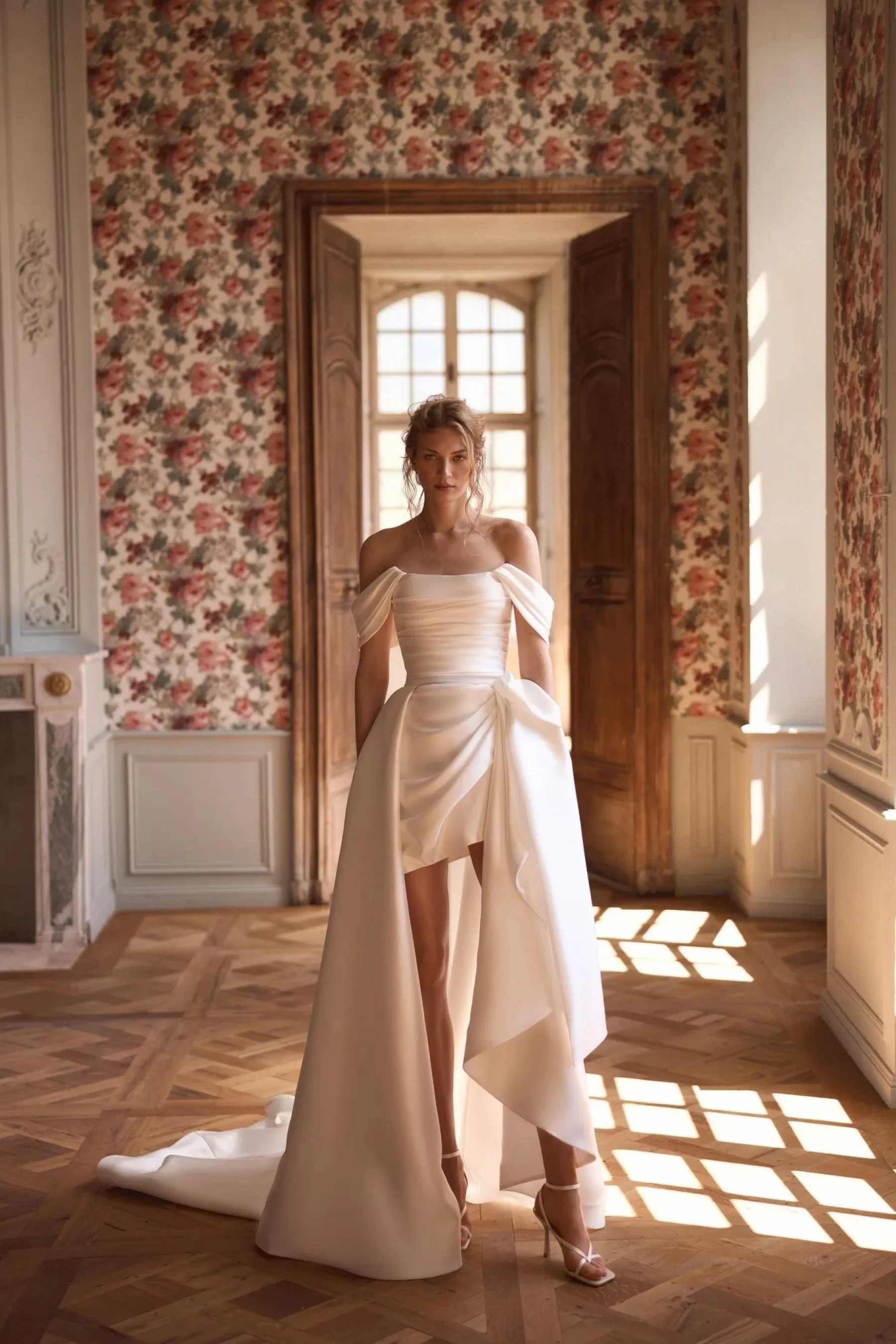 A modern and refined fitted silhouette gown in ivory – a successful combination of minimalism, elegance, and transformable design. The corset made of premium mikado fabric features an elegant boat neckline and is fully draped, creating a soft architectural line that emphasizes the shoulders and décolletage area. Detachable wing straps made of the same fabric add lightness and allow changing the mood of the look – from laconic to more romantic. The closure at the center back with hook-and-eye extenders ensures a perfect fit without disrupting the purity of the silhouette. The mini-skirt of fitted shape with a shaped hem maintains the overall style of the gown: it is also draped with mikado fabric, creating refined volume and accent on the hip line. A hidden zipper ensures convenience and neat appearance from all angles. For a more ceremonial look, the gown is complemented by a detachable voluminous skirt with a luxurious bow – the perfect option for a ceremony or festive occasion that easily transforms into a cocktail look.