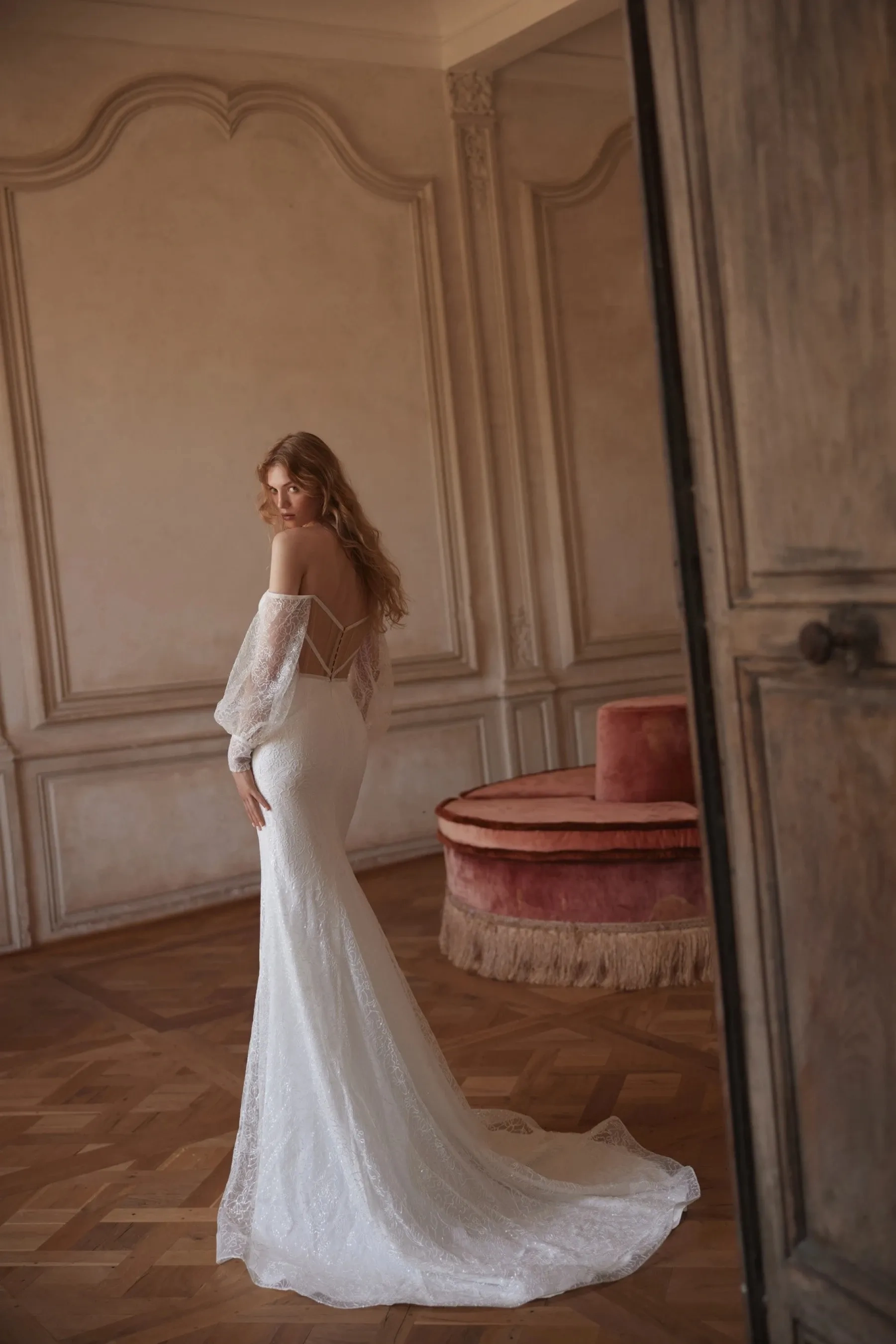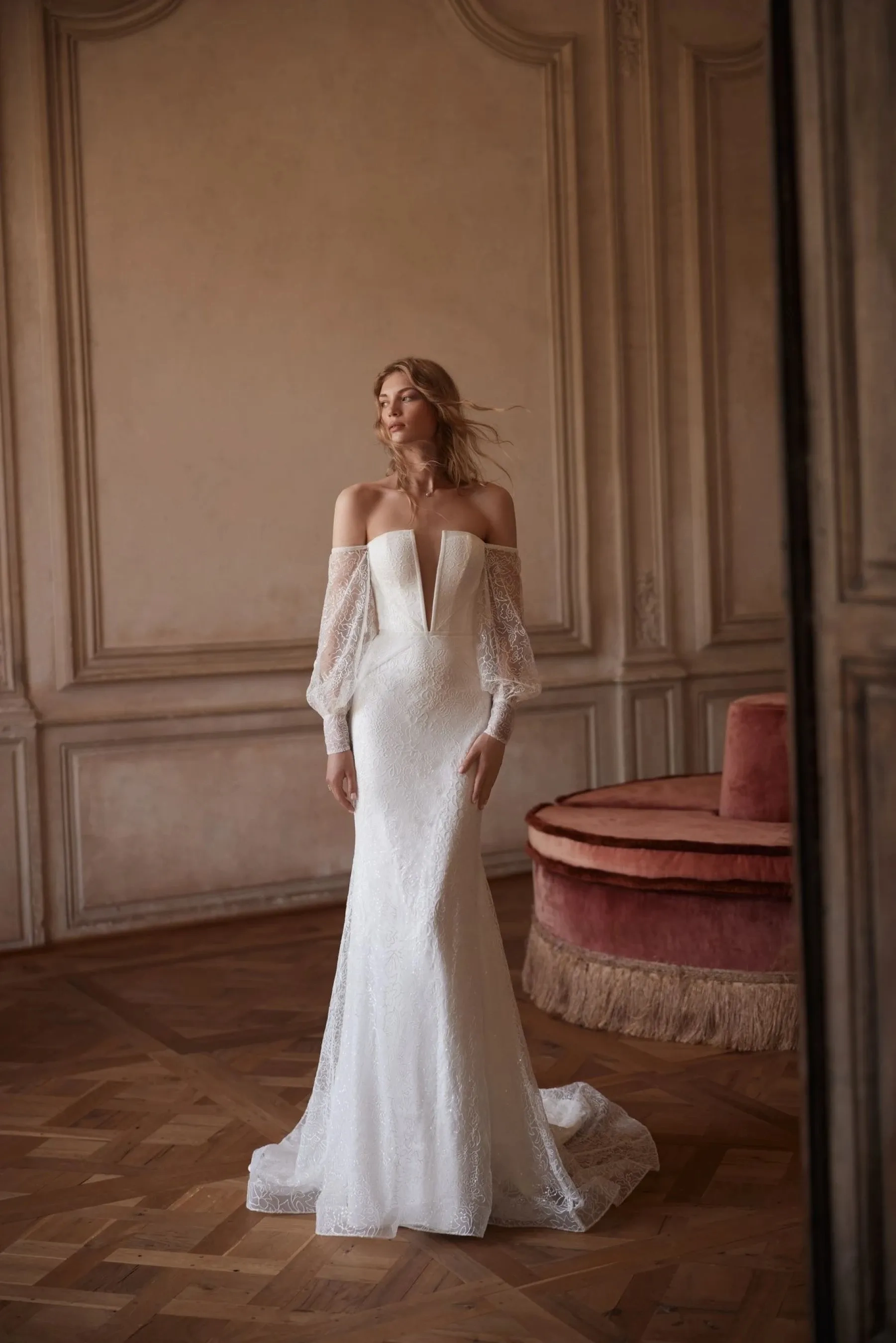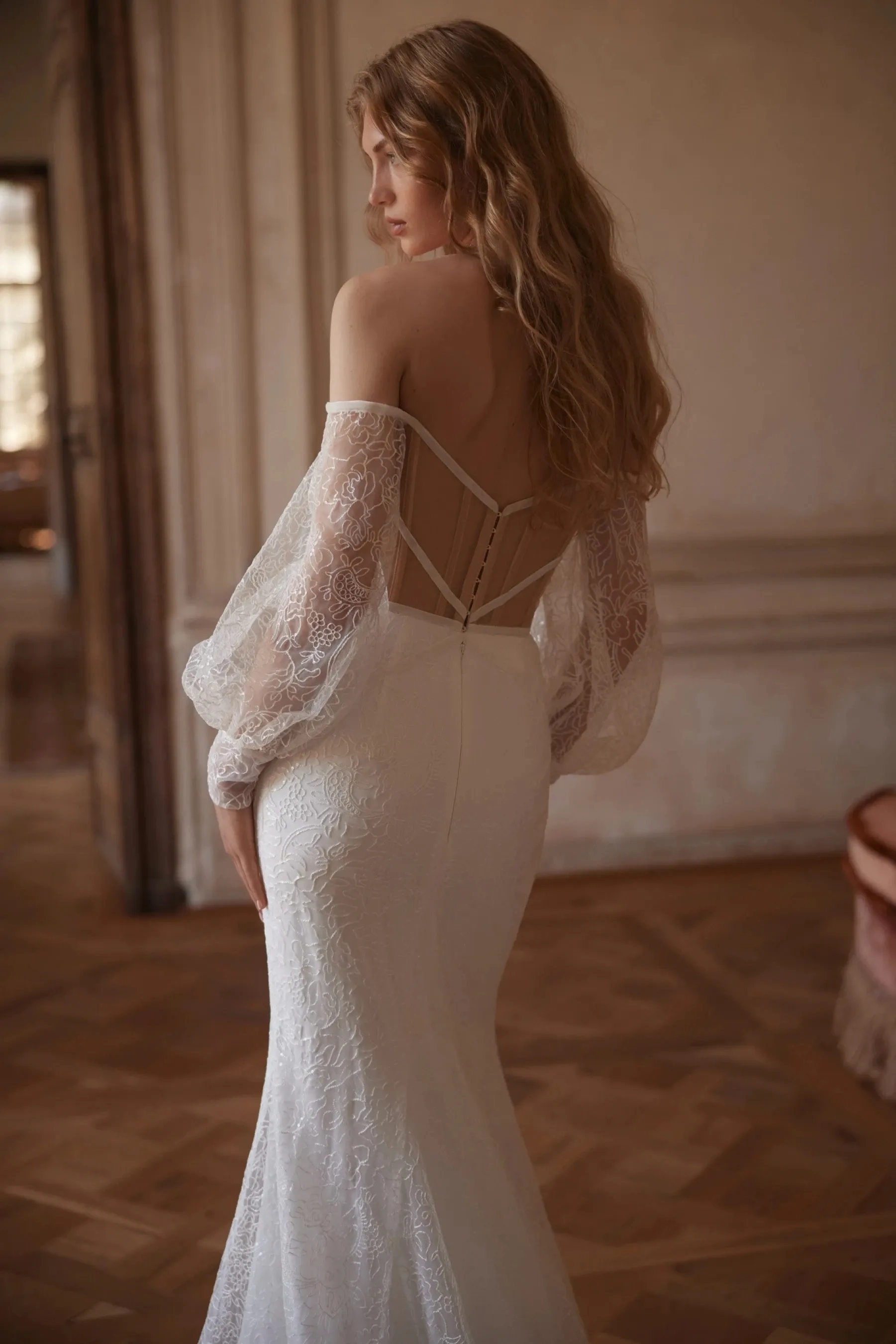 A romantic mermaid silhouette gown in ivory color – the embodiment of classic refinement with notes of gentle drama. The corset with a deep V-neckline is complemented by a semi-sheer central skin-colored insert that emphasizes the décolletage line and adds light contrast. The back is slightly curved, reveals the shoulders and collarbones, visually elongating the silhouette. The voluminous sleeves made of lace are finished with refined cuffs – the perfect combination of classic and modern. The entire gown is made of luxurious lace that gently hugs the figure. A fine velvet ribbon accentuates the waist, adding nobility and depth to the look. The fitted skirt smoothly expands downward, forming a luxurious train. The hidden zipper closure ensures comfort and flawless fit.