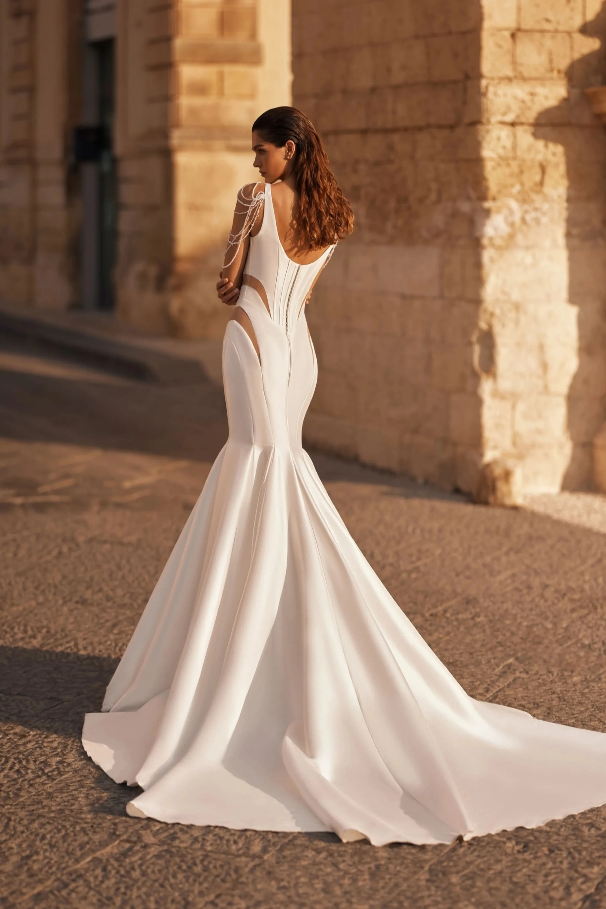 The ivory mermaid-style gown embodies elegance and modern sophistication.The mikado corset with a sweetheart neckline, structured with cut cups and straps, accentuates the delicate décolleté line. Sheer nude mesh side inserts add lightness, while hand embroidery makes the look unique and refined. The fitted mikado skirt with a train embraces the hips, creating a smooth and feminine silhouette. A concealed zipper at the back maintains clean lines and the gown’s elegant appearance.