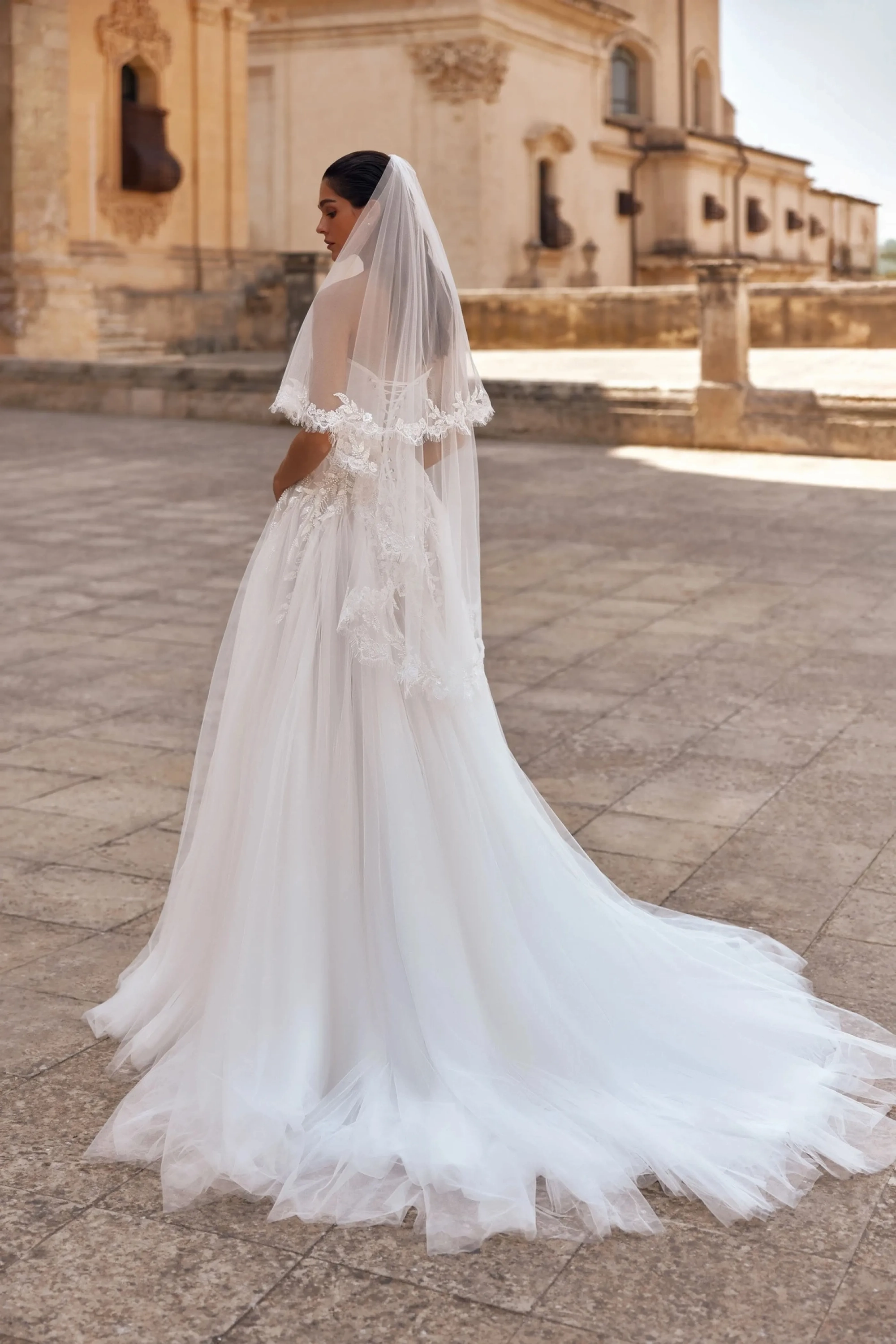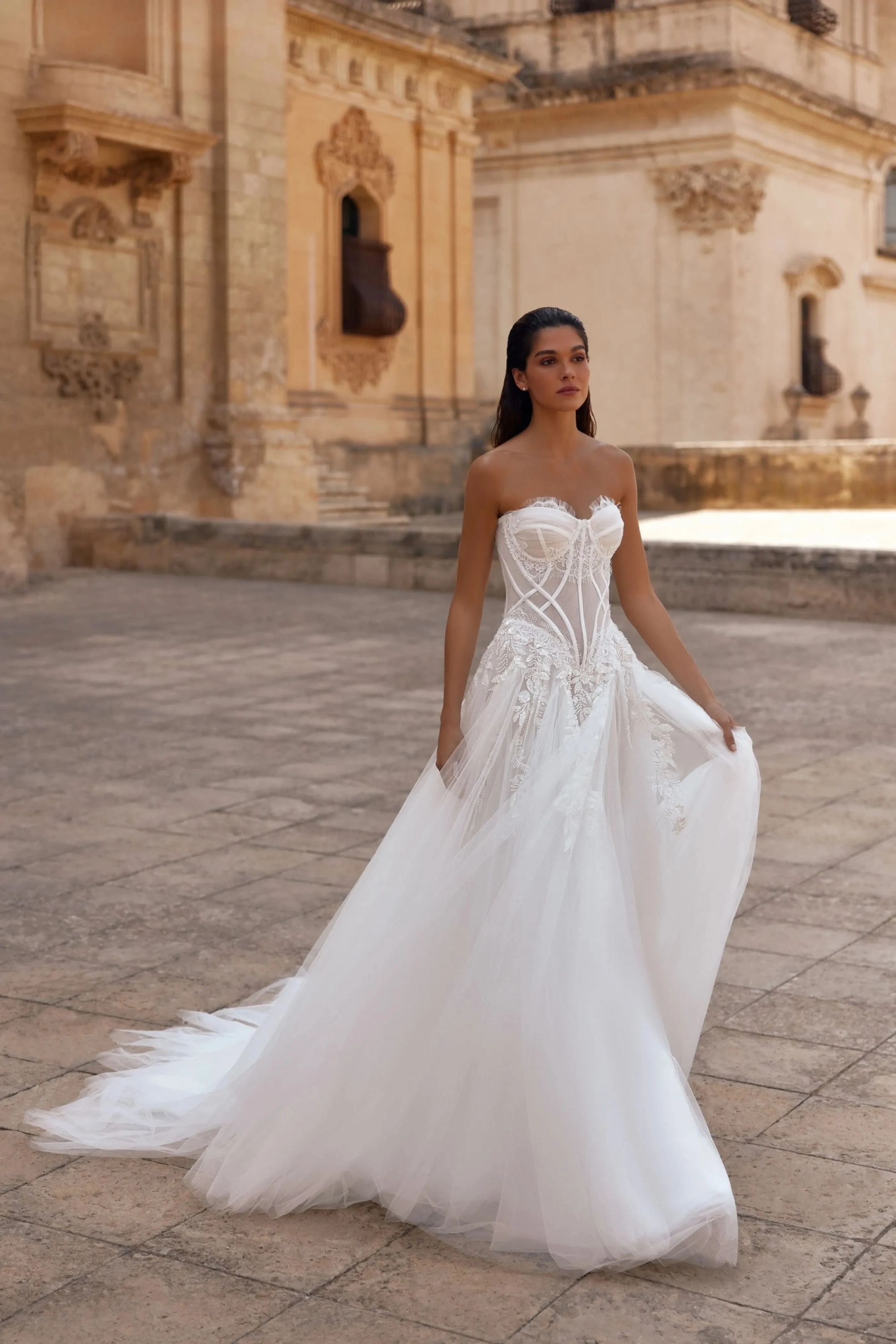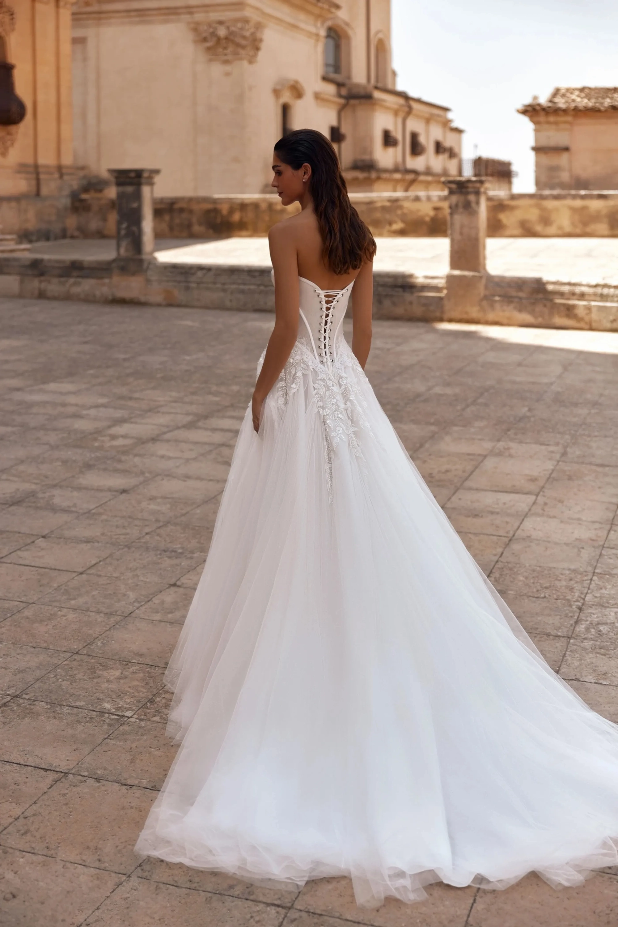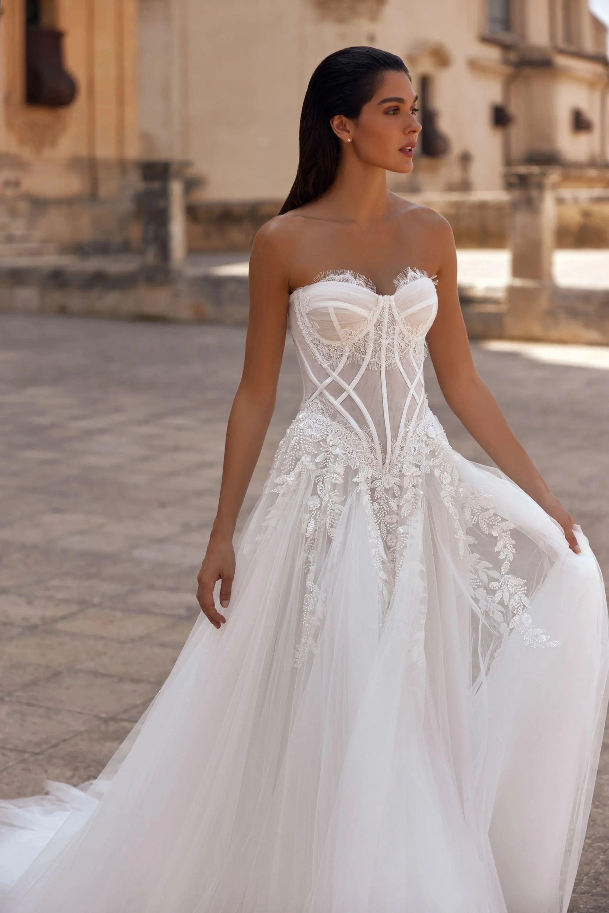 The ivory A-line gown is a delicate and romantic design for a bride who values elegance and attention to detail.The semi-sheer mesh corset with a sweetheart neckline, constructed with cut cups, accentuates the décolleté. Horizontal draping and lace on the cups add softness, while satin stripes highlight the figure’s contours. The V-shaped back with eyelets and lacing ensures a perfect fit and a polished silhouette. The full tulle skirt with a train harmoniously continues the motifs of the corset. Additional panels in the top layer add volume, and embroidered appliqués flow seamlessly from the corset, creating a cohesive and elegant look. A concealed zipper at the back maintains clean lines. The model is also available with a corset closure using hook extenders for added convenience and a precise fit.