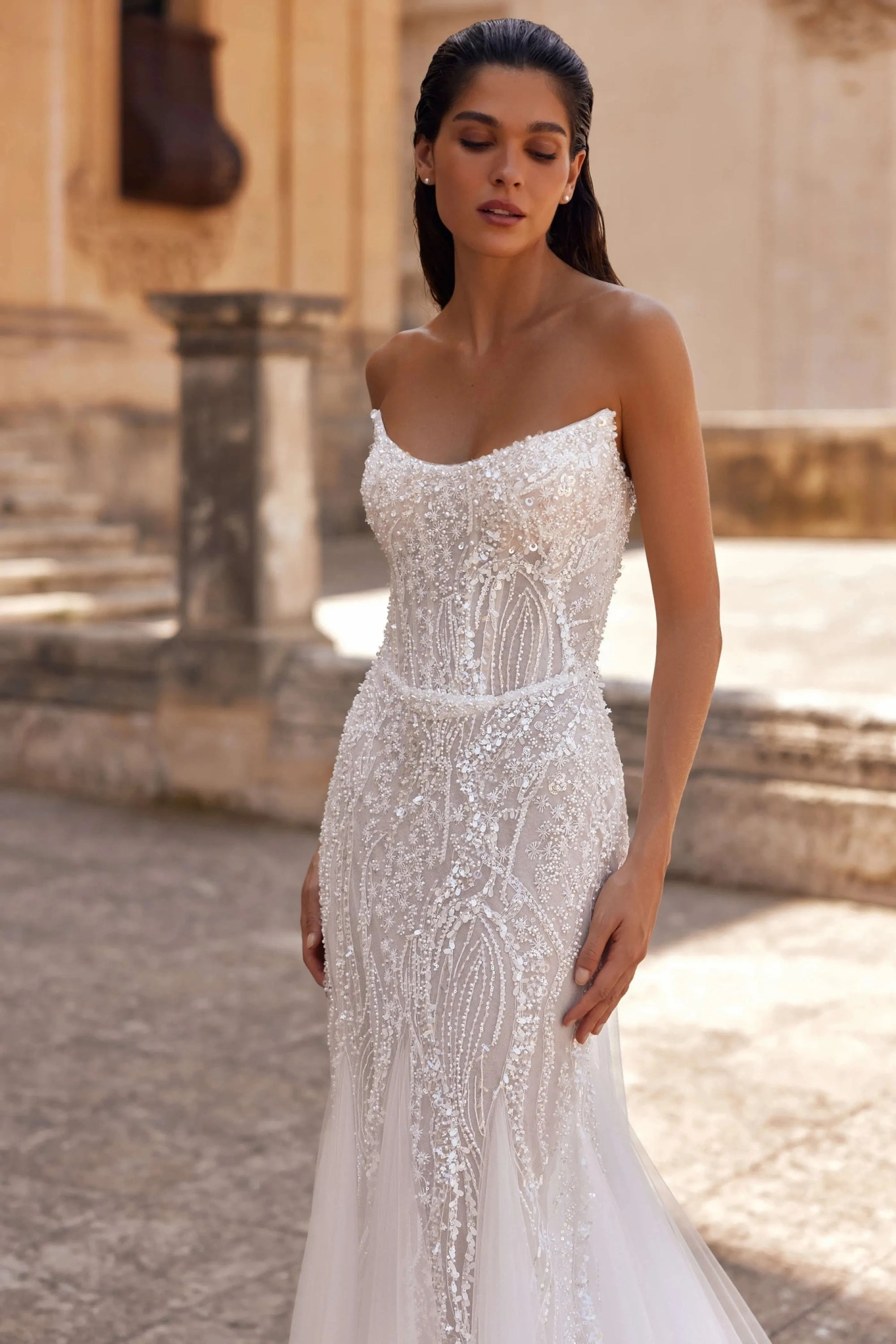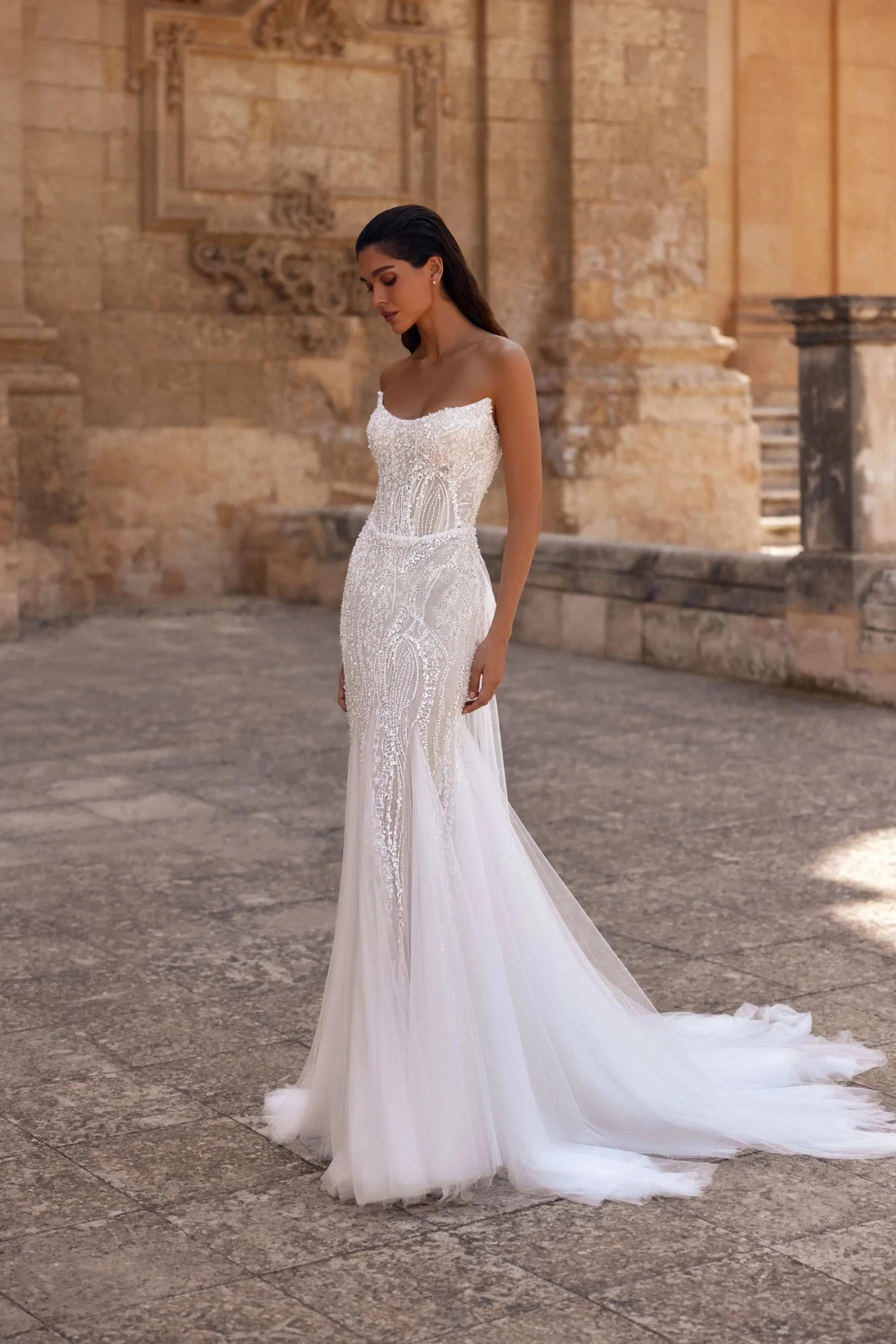 The ivory mermaid-style gown embodies luxury and refined femininity.The semi-sheer boat-neck corset is crafted from embroidered lace and adorned with beads, pearls, and crystals. The straight back, positioned at the shoulder blades, features wide tulle lacing that ties into an elegant bow at the waist, while the hook-and-eye closure with extenders ensures a perfect fit. The fitted skirt with a train combines a top layer of embroidered lace with tulle panels underneath, adding volume and grace. A concealed zipper at the back maintains a clean silhouette. The model is also available with a skirt lining.