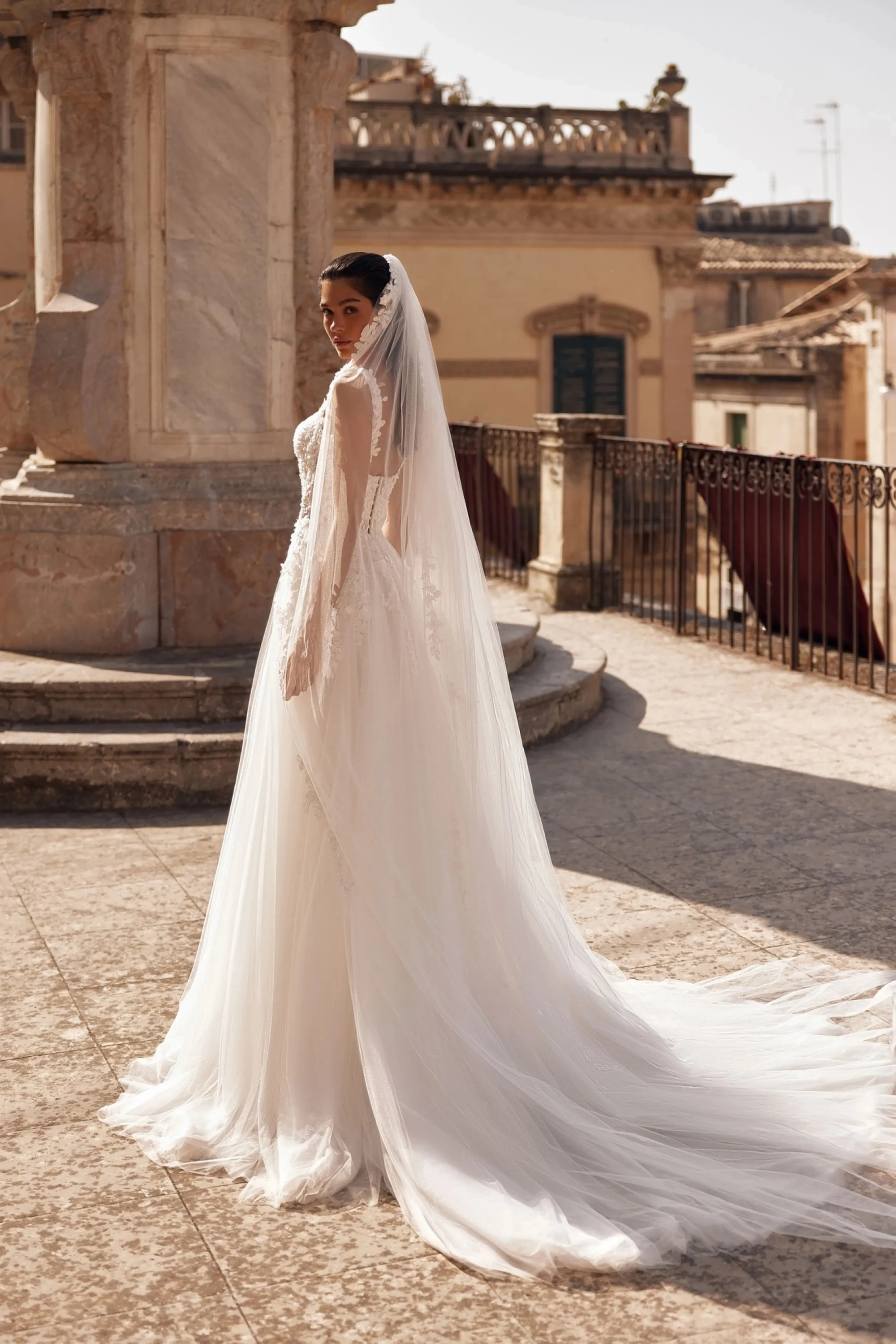 The ivory A-line gown embodies delicacy and romance in every detail. The semi-sheer sweetheart corset is draped with delicate tulle folds and adorned with 3D-effect appliqués, creating the impression of living flowers on the fabric. Thin straps emphasize the lightness of the silhouette, while the U-shaped back above the waist adds refinement. The hook closure ensures a perfect fit while maintaining clean lines. The tulle skirt with a luxurious train flows softly from the waist, giving the look volume and lightness. Embroidered appliqués cascading from the corset onto the skirt create a harmonious transition, emphasizing the unity of all details. A concealed back zipper completes the look, leaving it impeccably seamless.
