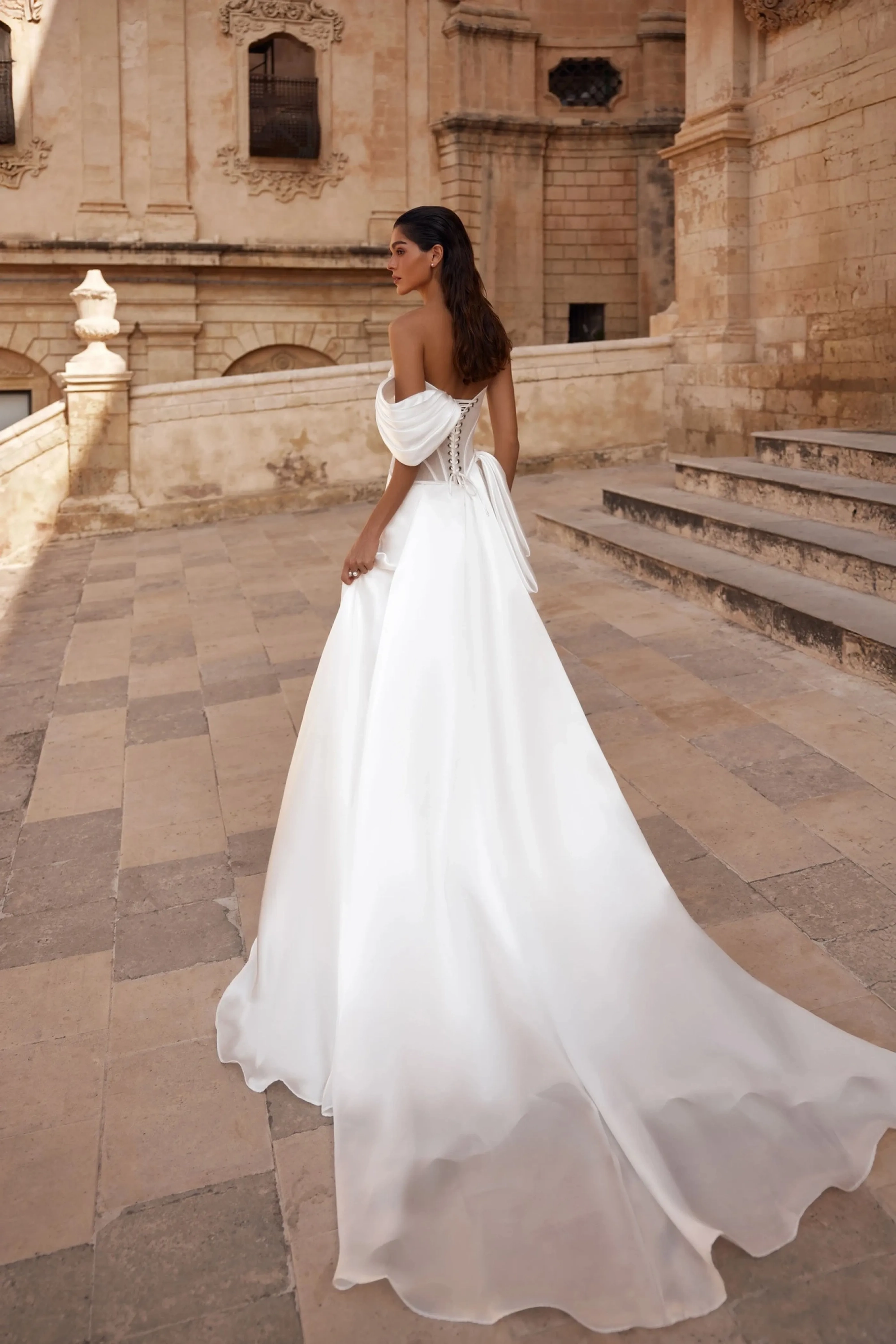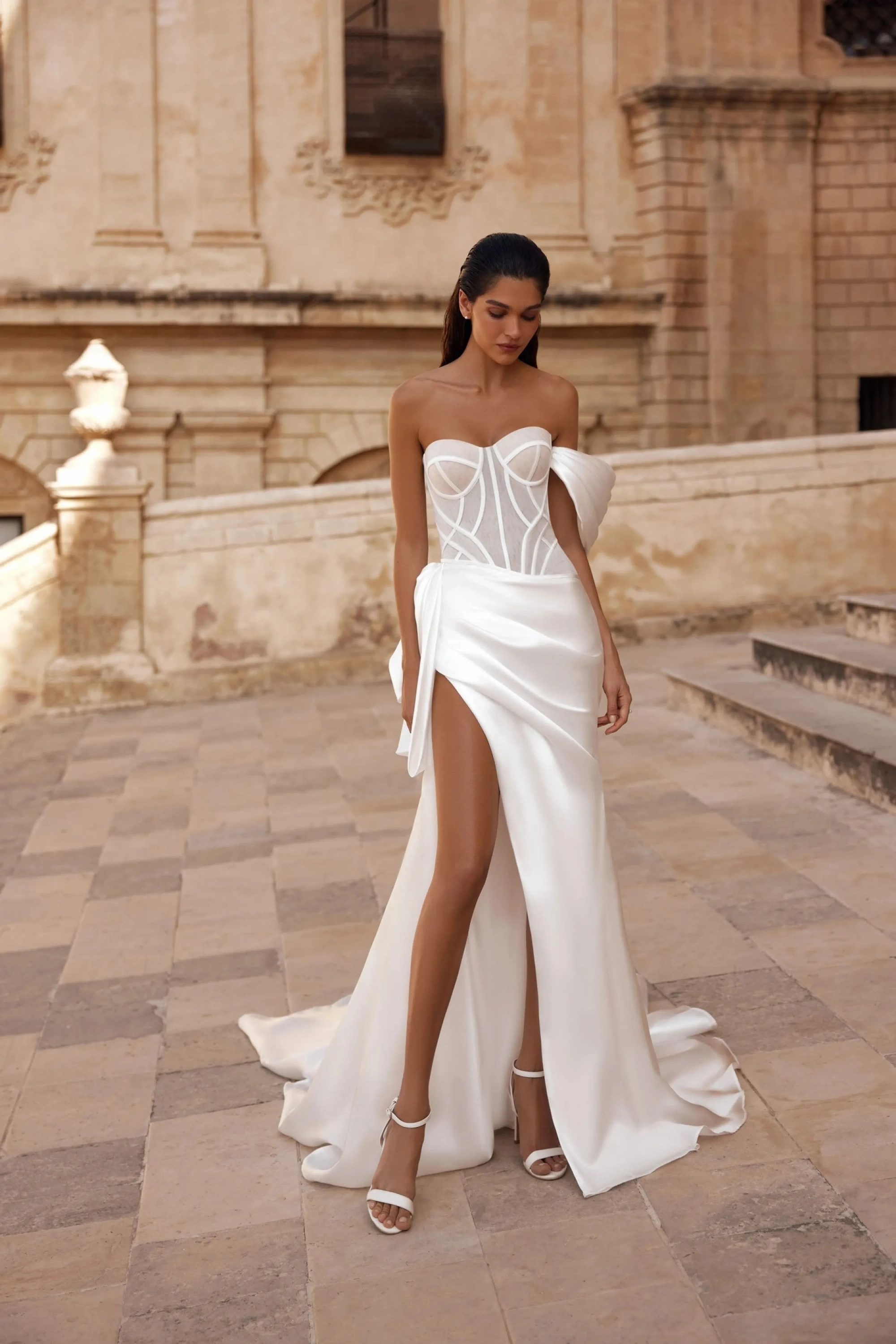 The ivory mermaid-style gown combines elegance with contemporary refinement. The semi-sheer sweetheart corset, constructed with cut cups, is accented with satin stripes that highlight the body’s contours. The V-shaped back with an eyelet-and-lacing closure ensures a perfect fit and a graceful silhouette. The fitted Prado fabric skirt with a train features a right-side slit, with the front adorned with diagonal pleats. A voluminous bow at the slit and a thin waistband along the asymmetric corset seam create a refined accent. A concealed back zipper maintains clean lines. The look is completed with a detachable wing sleeve, and an optional hook-and-eye closure with extenders is also available.