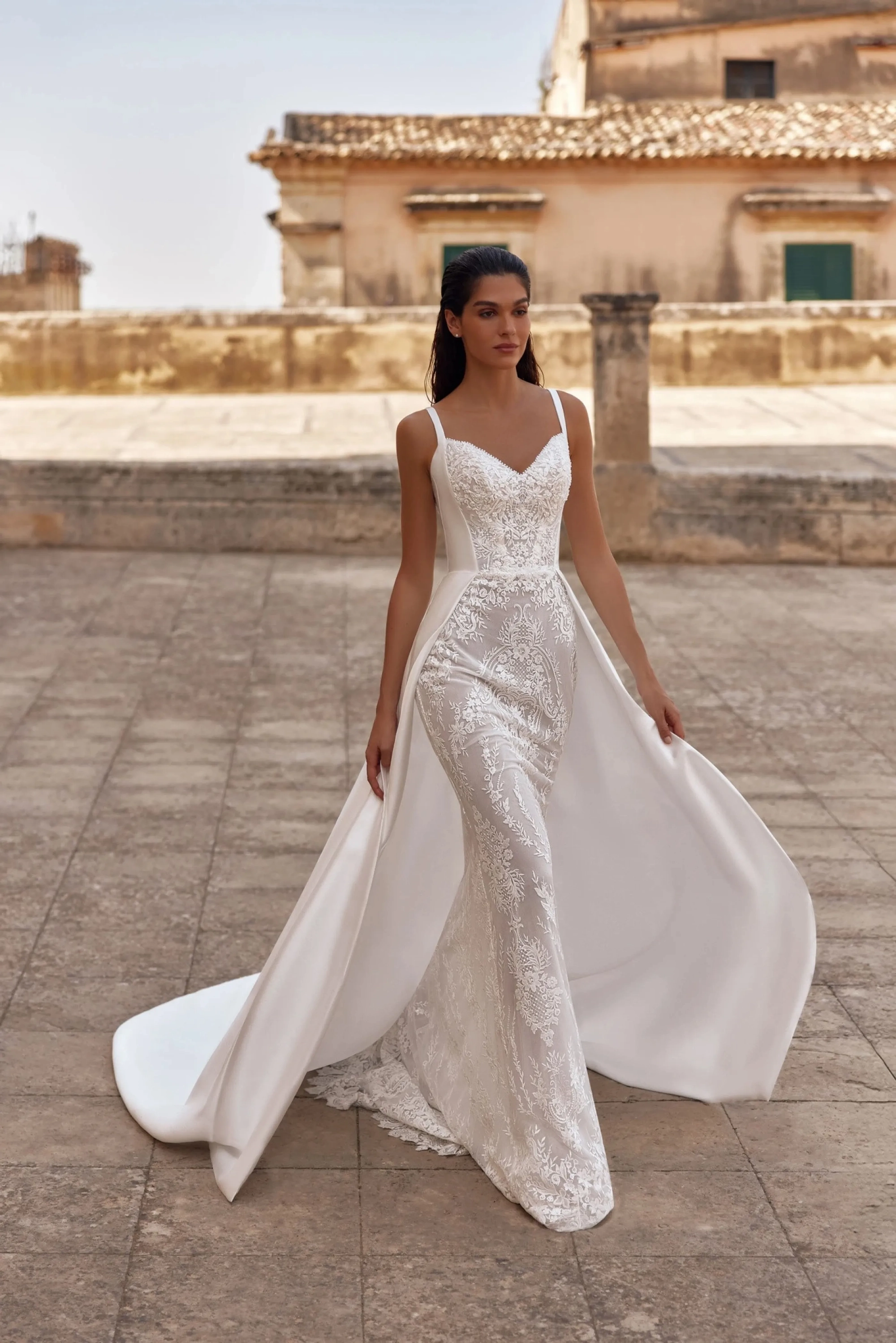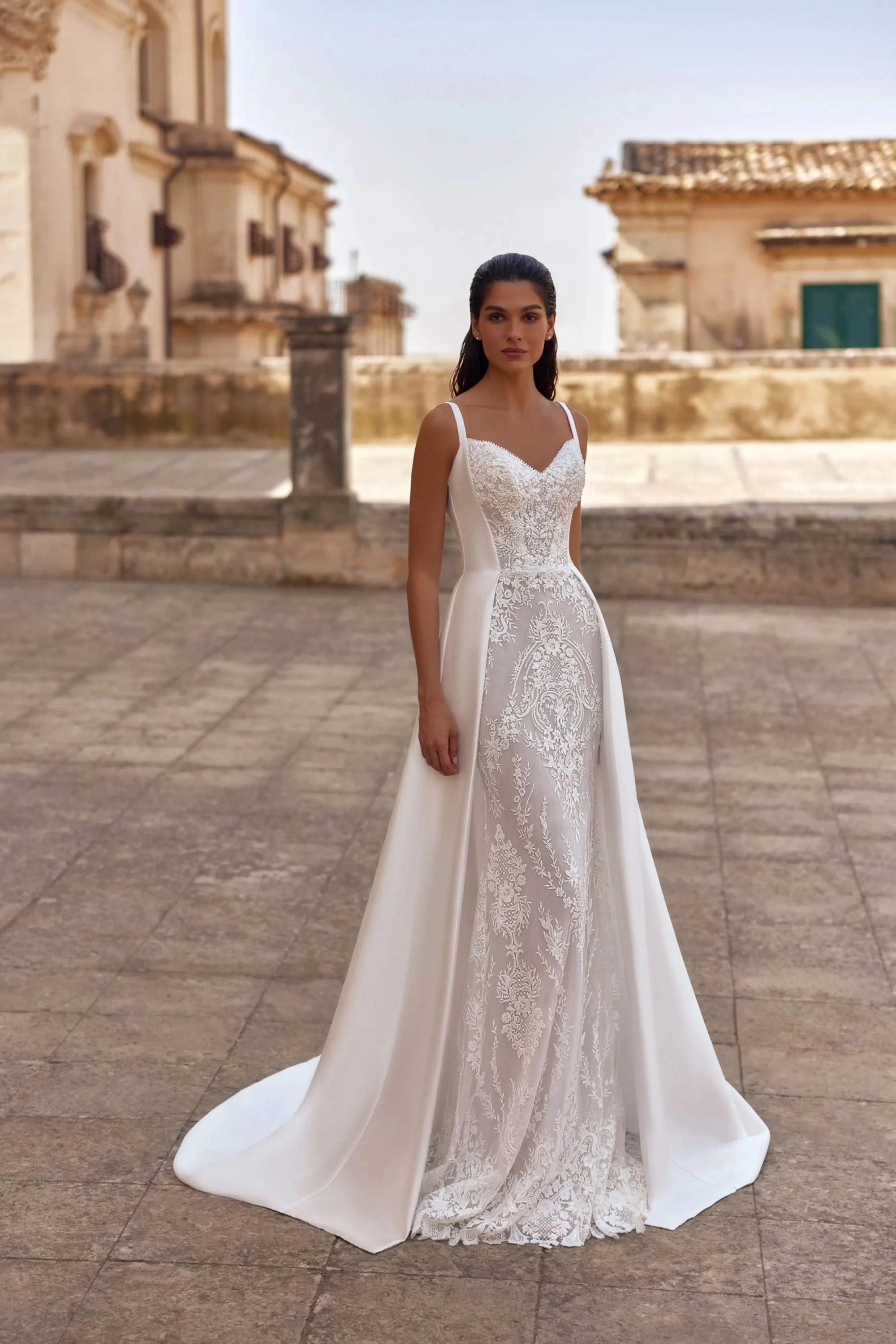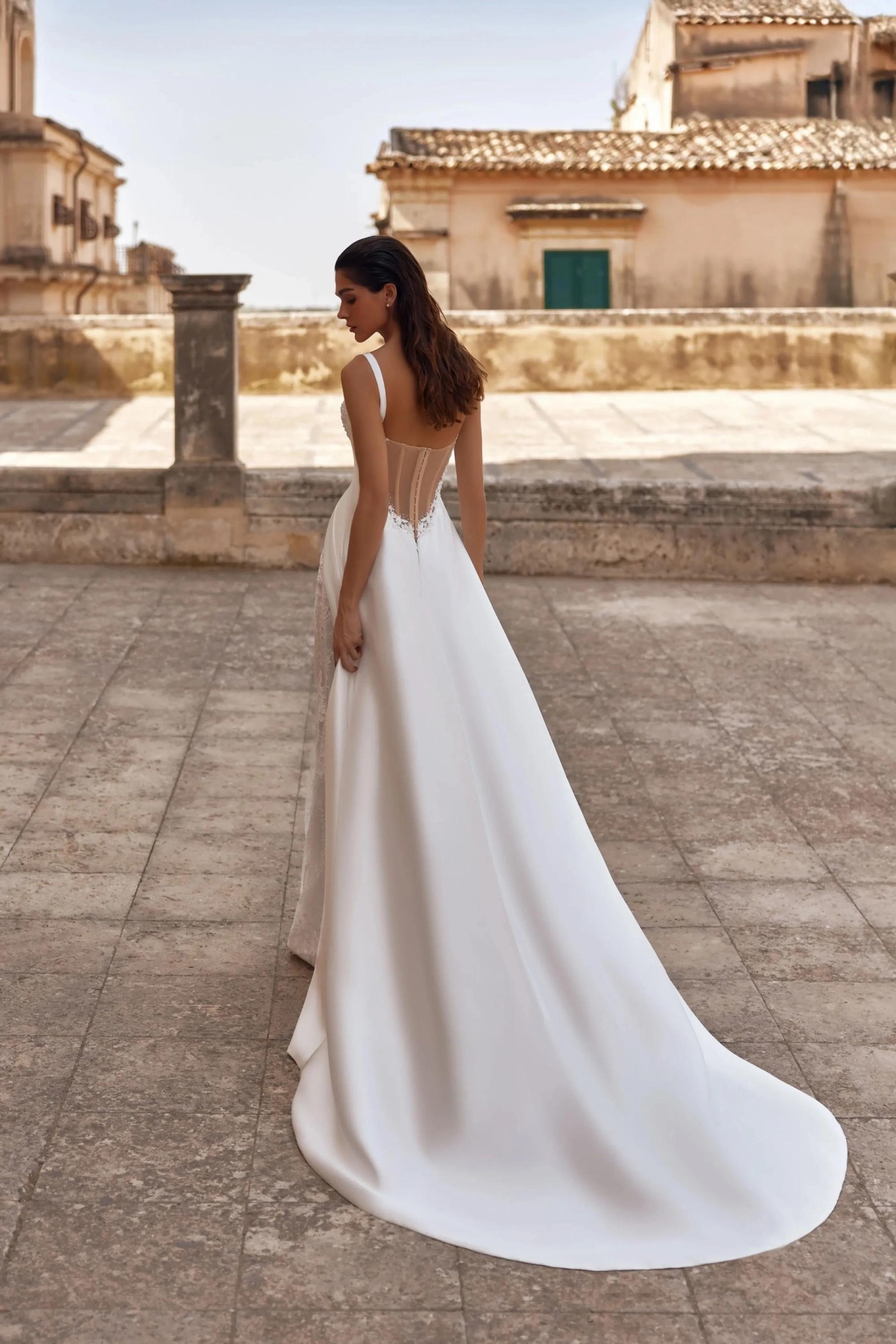 The ivory A-line gown combines the delicacy of lace with the nobility of mikado, creating a harmonious and refined look. The semi-sheer sweetheart corset is made of lace and adorned with hand embroidery. Nude mesh inserts on the back are slightly concave below the shoulder blades, and the hook-and-eye closure with extenders ensures a perfect fit. The semi-sheer skirt, fitted at the hips and flowing into a train, combines a lace overlay with a mikado A-line panel. An embroidered brooch at the waistline adds a finishing touch and elegant accent, while a concealed back zipper maintains a clean silhouette. The model is also available with a lined skirt.