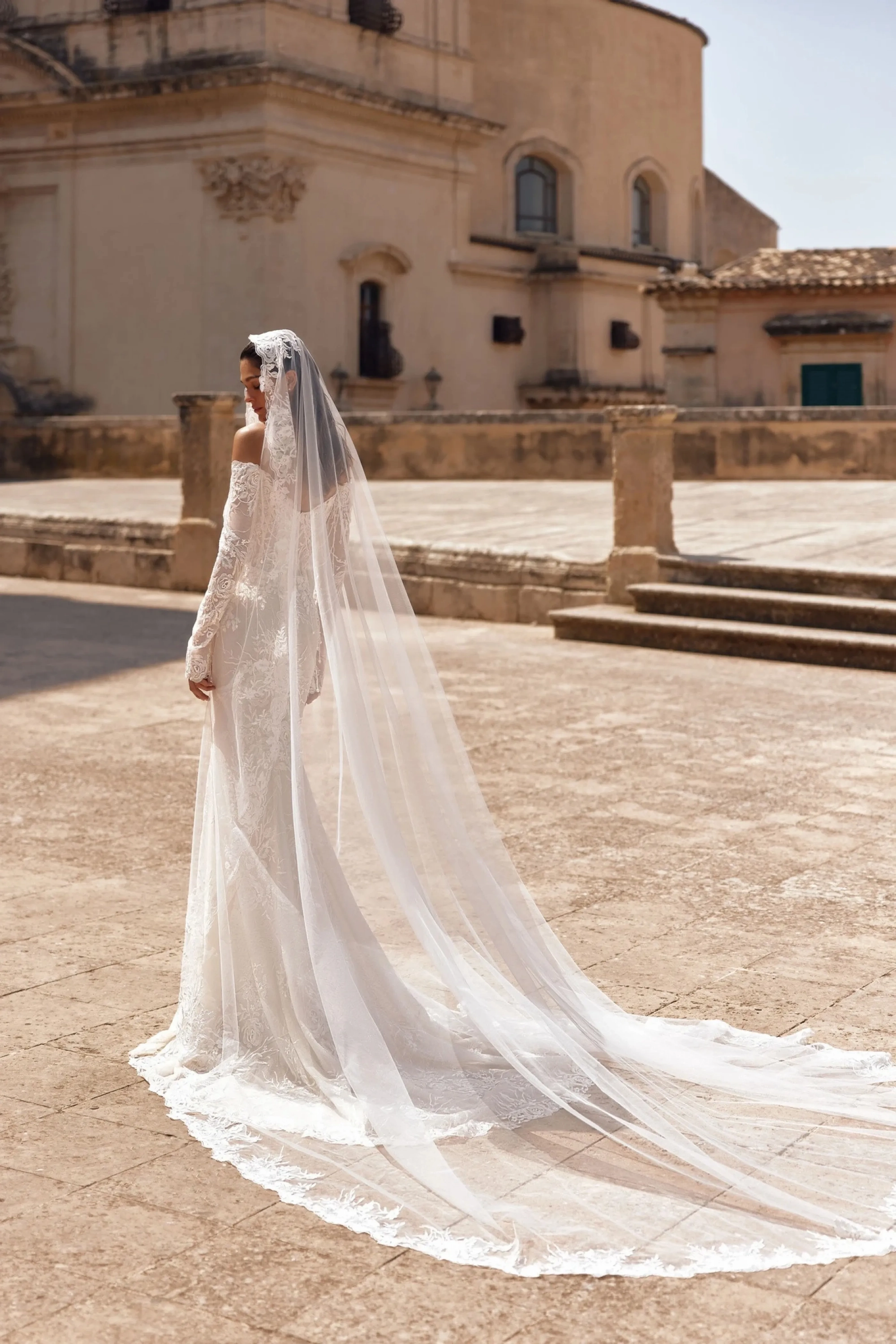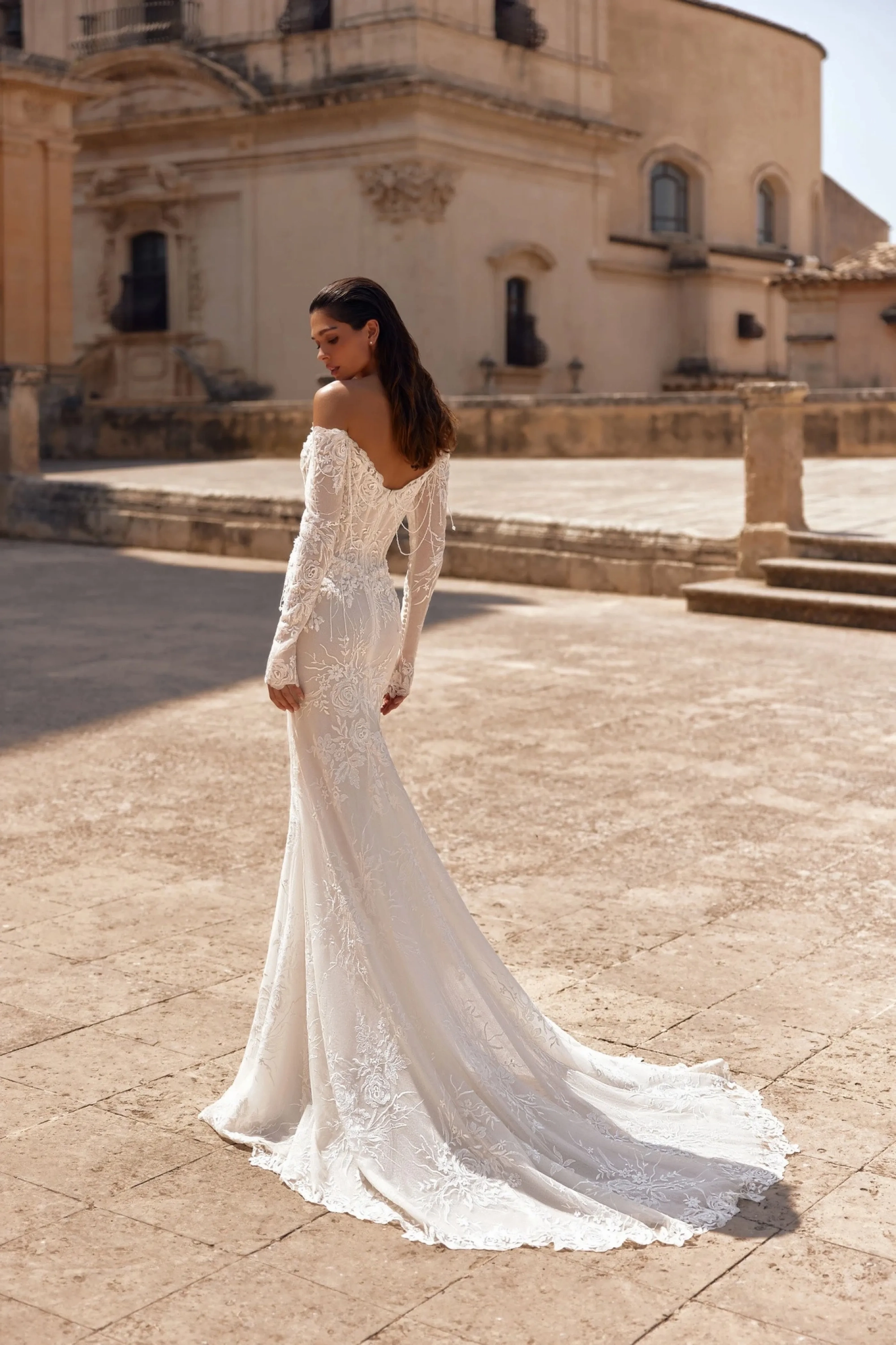 The light skin mermaid-style gown embodies refinement and modern romance. The semi-sheer boat-neck corset, made of lace, flows seamlessly into long forearm-length sleeves. The neckline is accented with hand embroidery and 3D-effect appliqués, while the slightly concave back below the shoulder blades, with a hook-and-eye closure with extenders, adds a delicate touch. The fitted skirt with a train, topped with a lace overlay, harmoniously continues the corset’s design motifs. The V-shaped seam of the skirt is adorned with 3D-effect appliqués that seamlessly extend from the corset, and a concealed back zipper maintains a clean silhouette. The model is also available in ivory and with a lined skirt.