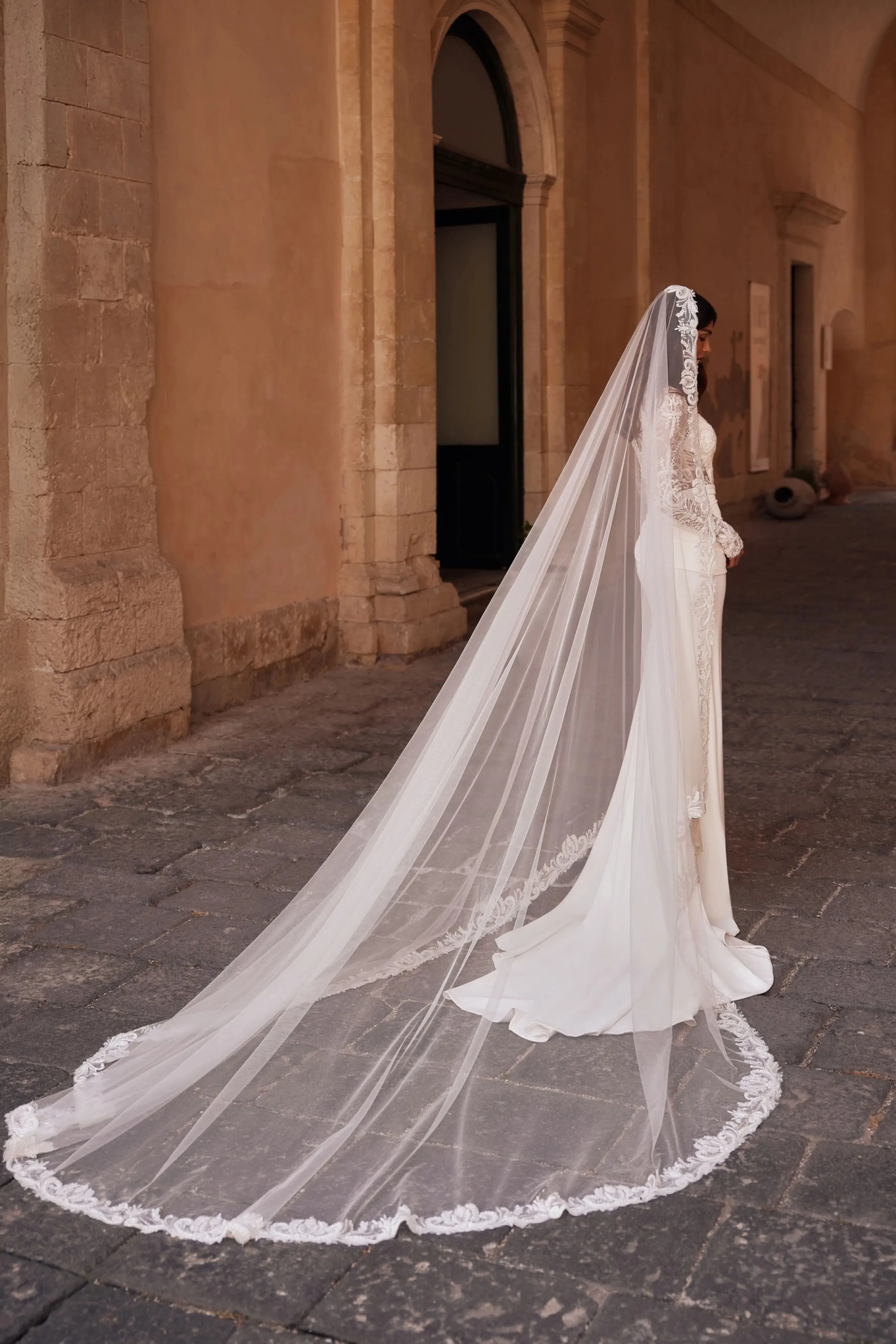 The ivory mermaid-style gown combines classic elegance with modern sophistication. The lace corset features a modest V-neckline with a central nude insert and long sleeves. The semi-sheer back, made of nude mesh and embroidered lace, closes with loops and buttons, creating a delicate and feminine look. The fitted skirt with a train in tailored fabric gently hugs the hips, emphasizing the silhouette, while draping at the hip area adds lightness and a textural accent. A wide waistband at the natural waist completes the look, and a concealed back zipper maintains a clean silhouette.
