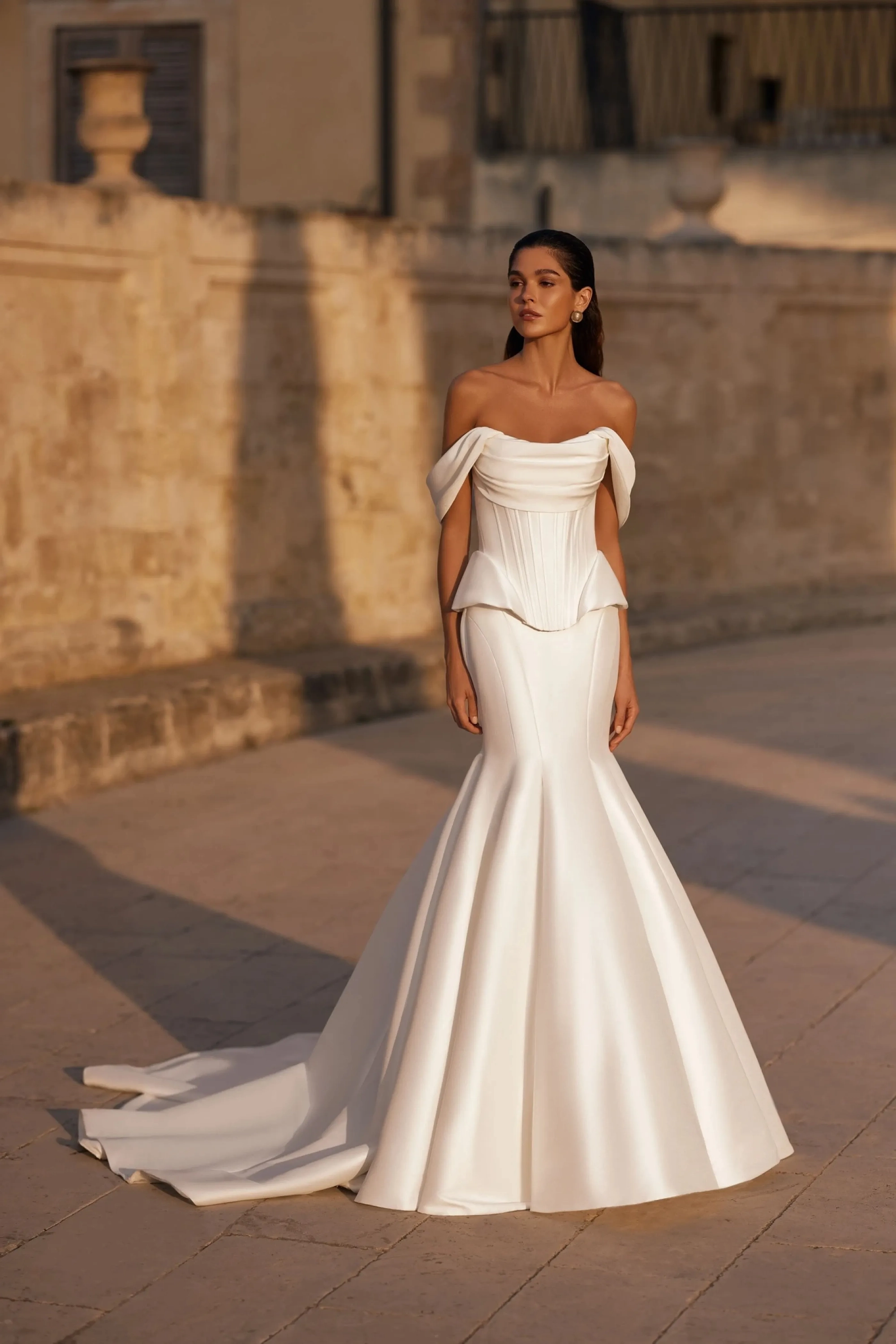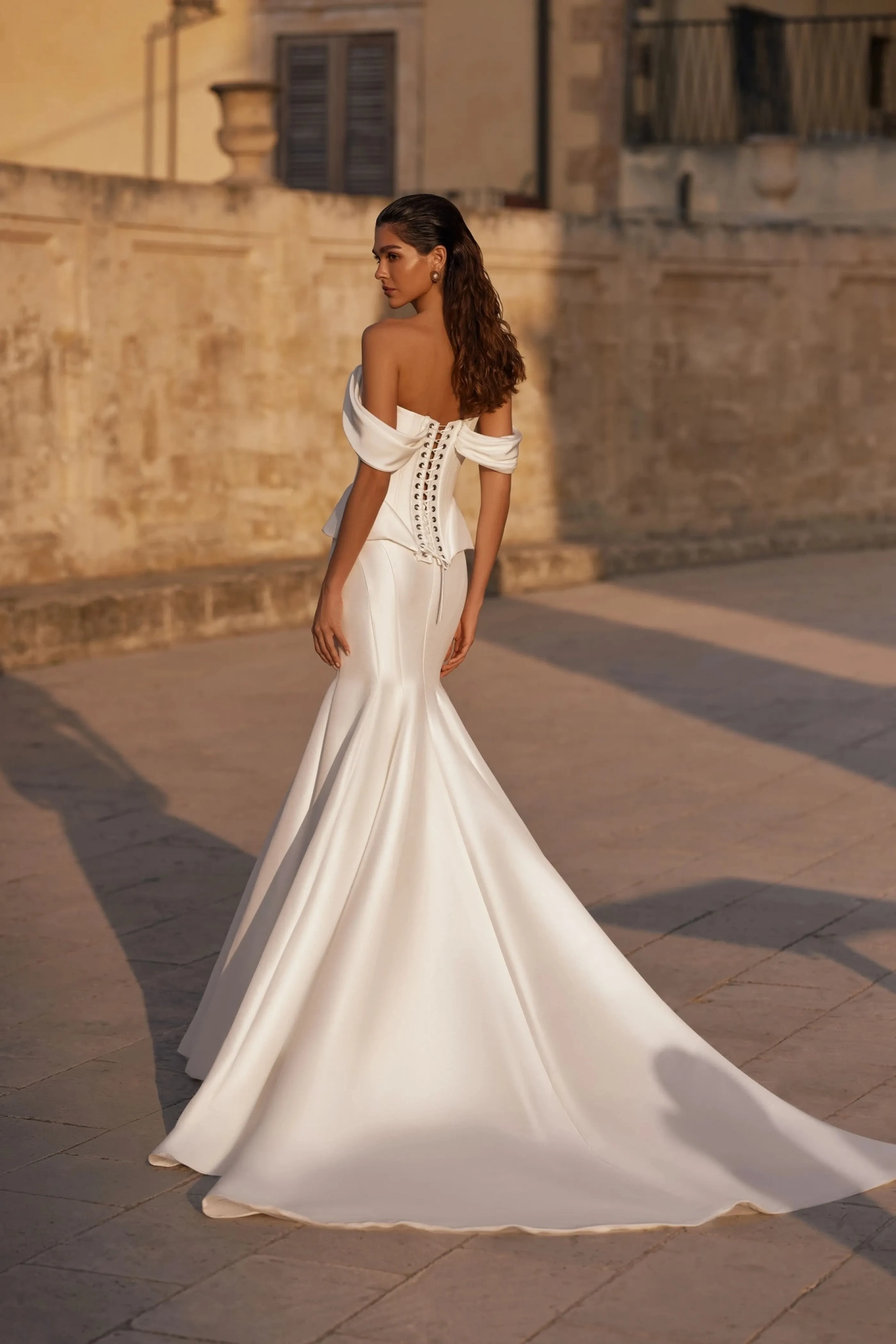 The boat-neck corset is adorned with draping, while the structural lines are highlighted with decorative topstitching. The shaped hem is complemented by decorative panels, and the slightly concave back with a hook-and-eye closure and lacing ensures a perfect fit. Wide draped straps fall over the forearms, creating a delicate and refined accent. The fitted skirt – Skirt 1007-FM050 – with a train gently hugs the hips, while the concealed back zipper maintains clean lines, emphasizing the gracefulness of the look.