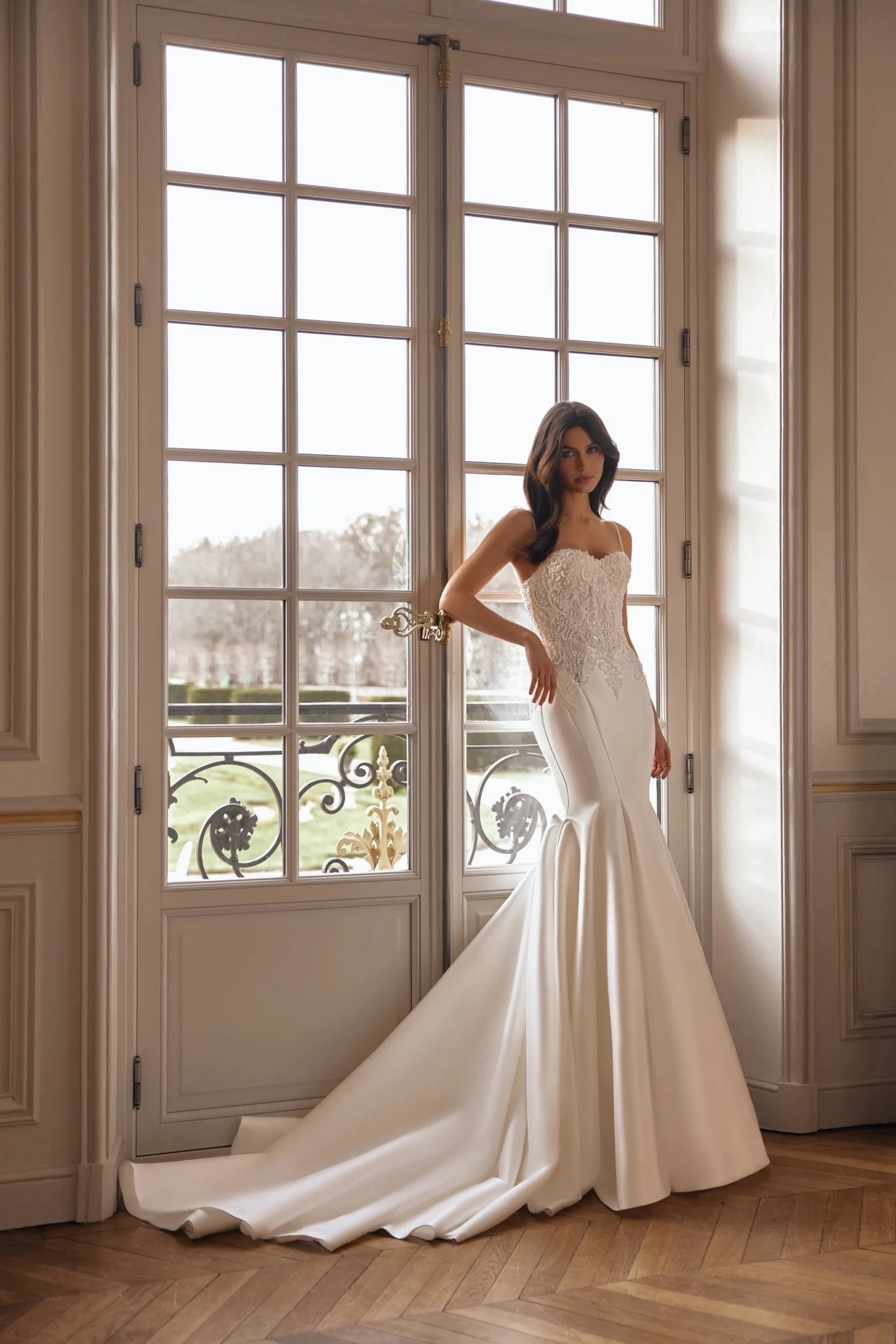 A mermaid silhouette gown in Ivory with a semi-sheer sweetheart corset on thin straps, adorned with embroidered appliqués that seamlessly flow onto the skirt, masking the seam line. The slightly concave back below the shoulder blades and the shaped lower edge of the top emphasize a refined waist. The fitted skirt with a long train is made of stretch fabric, with volume created through structured panels that flare at the knees, forming a smooth, graceful silhouette. A concealed central back zipper completes the design.