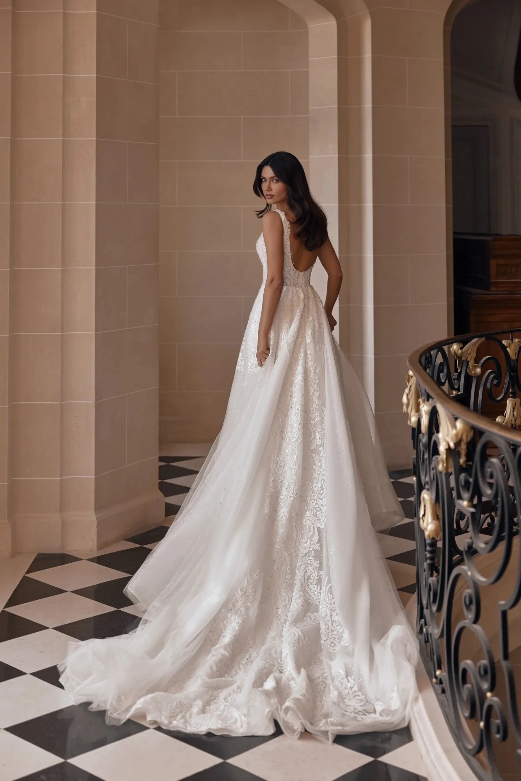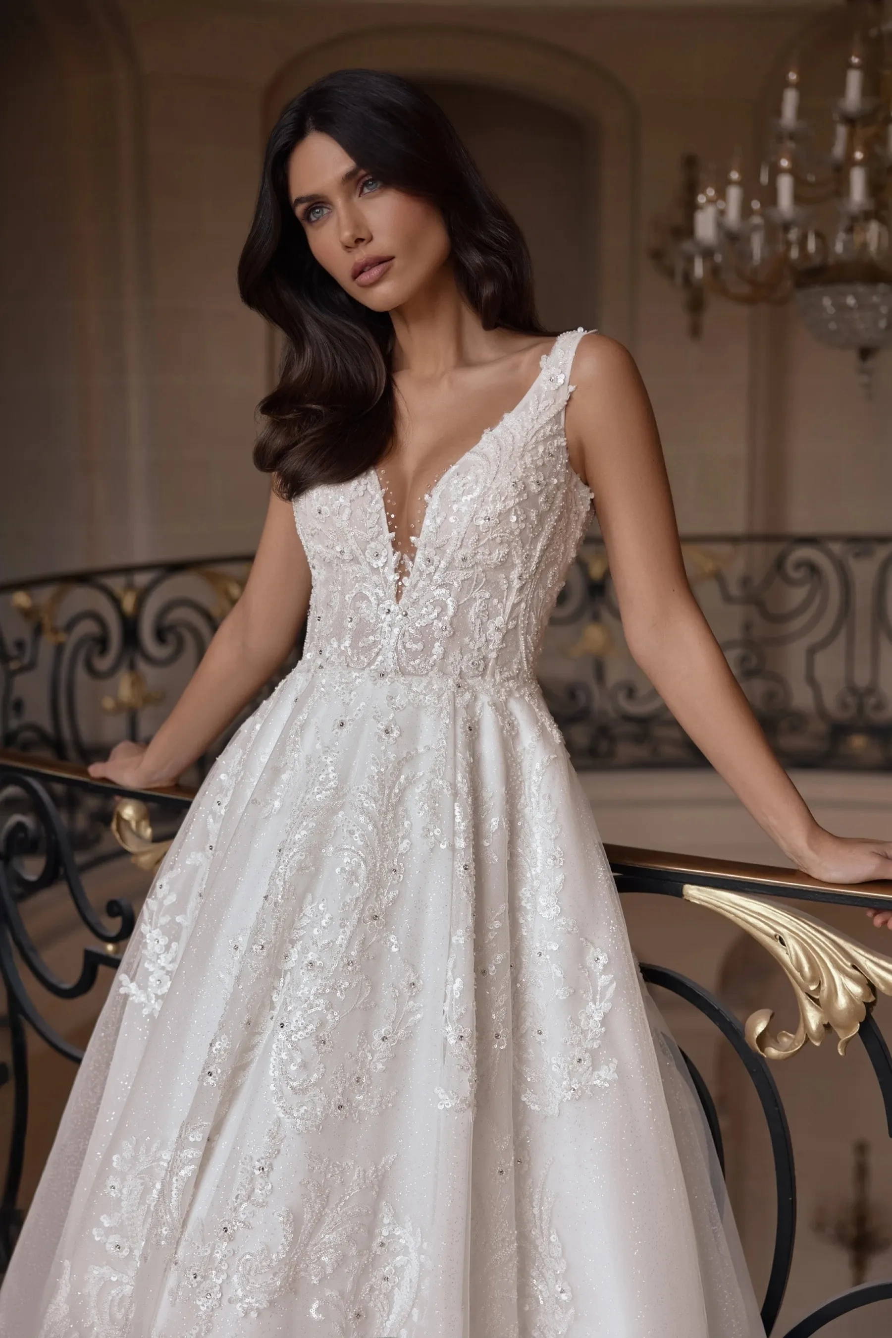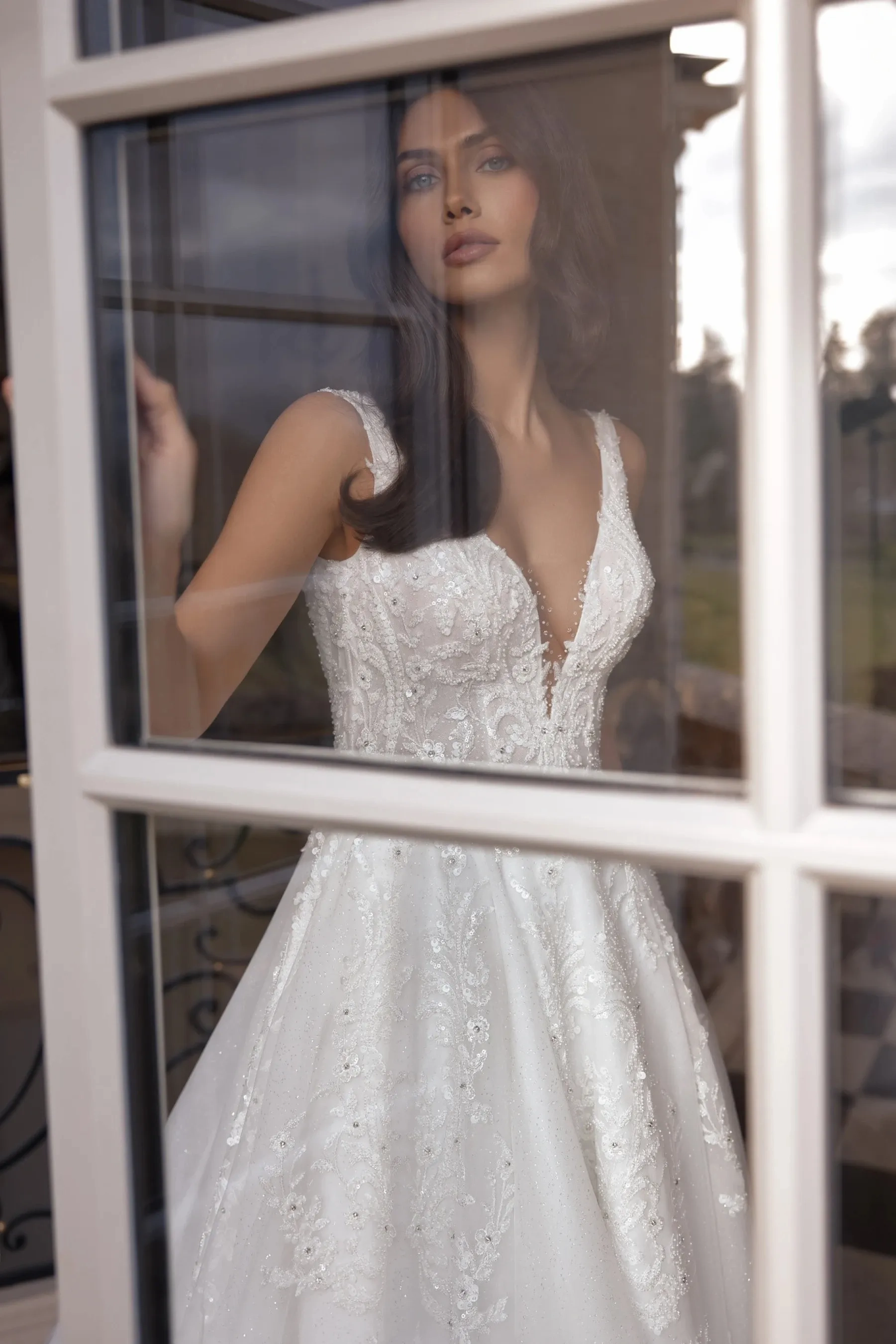 An A-line gown in soft Ivory combining classical refinement with modern texture lightness. The V-neck corset flows into a strap, emphasizing the shoulders’ elegance. A nude mesh front insert with hand embroidery adds delicacy. The slightly U-shaped back sits just above the waist, framing the back harmoniously. The full skirt with a train is made of soft tulle layers. The top edge features a central bow fold for grace and dynamic movement. Embroidered appliqués echo the corset motifs, creating a finished, elegant, and romantic look. A central concealed back zipper ensures perfect fit.