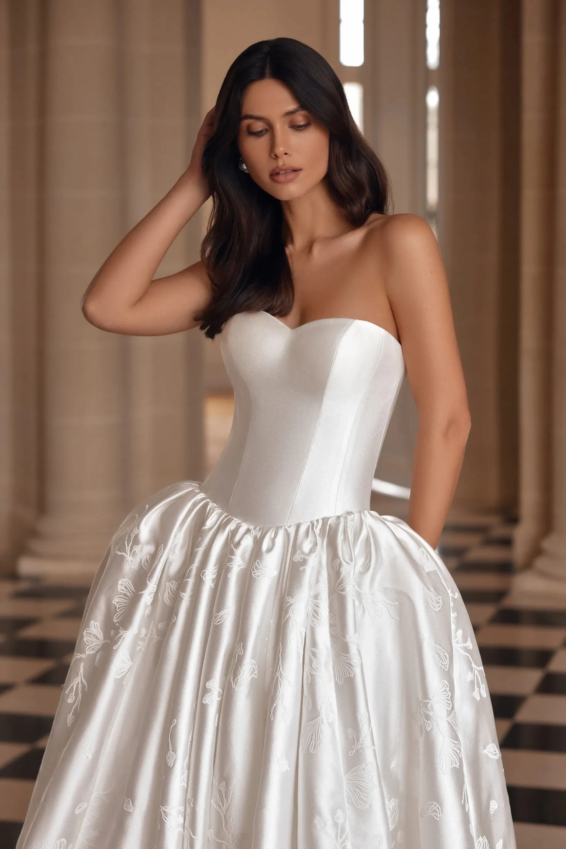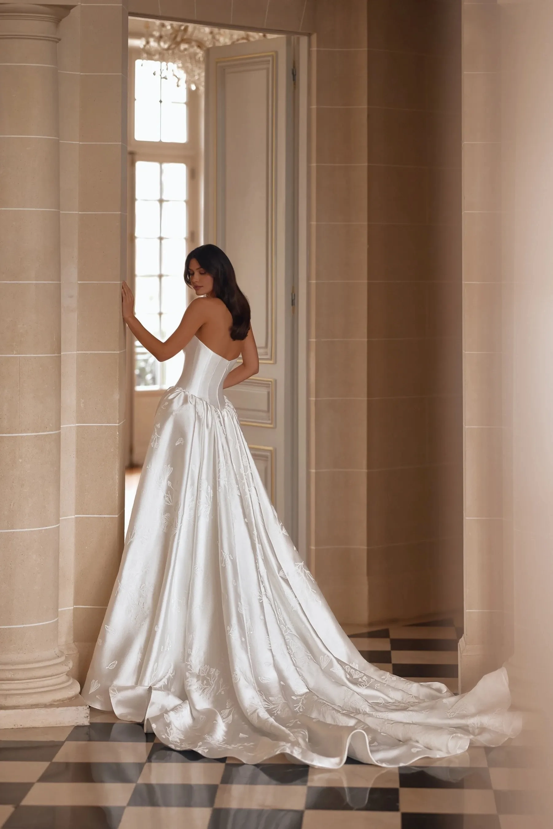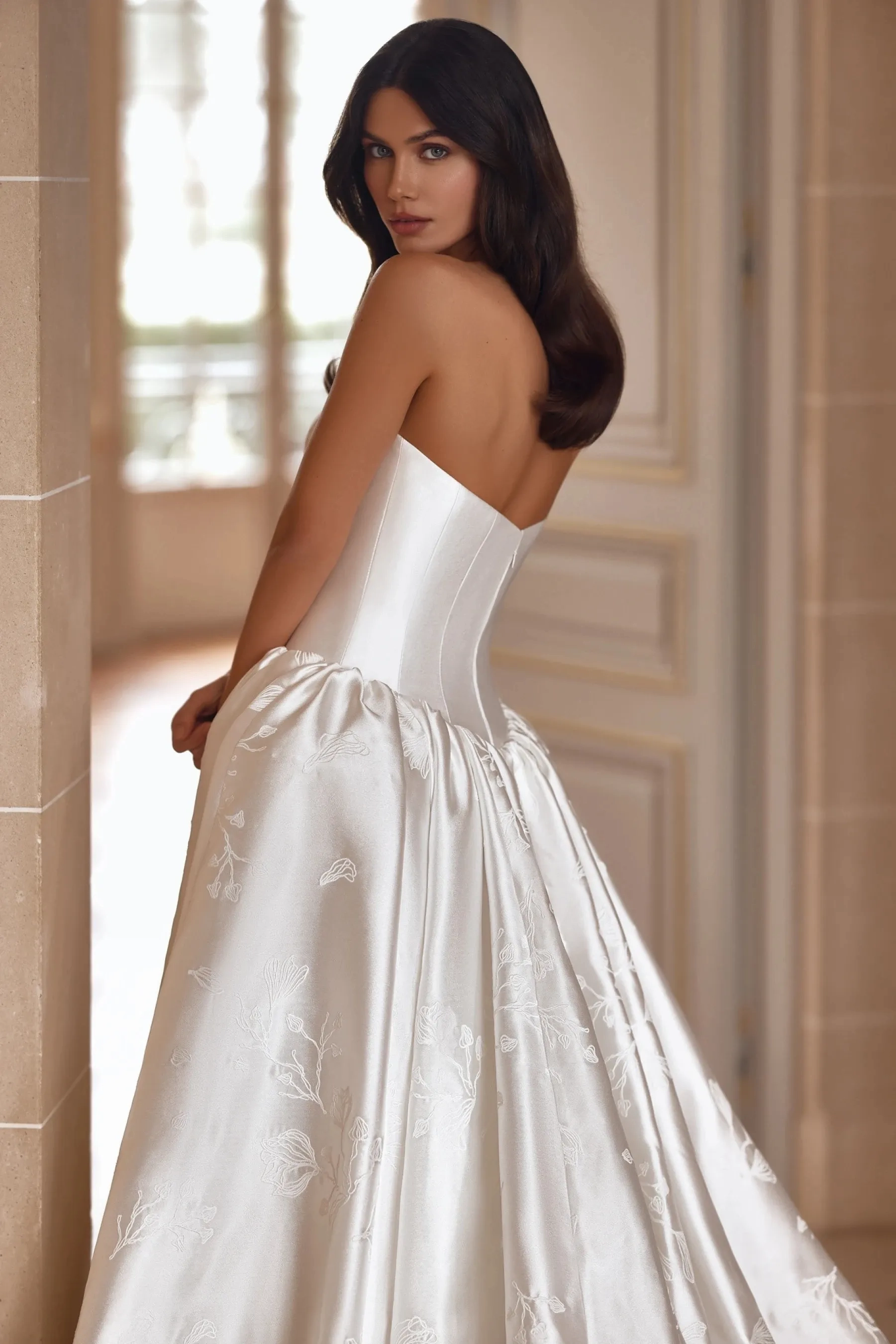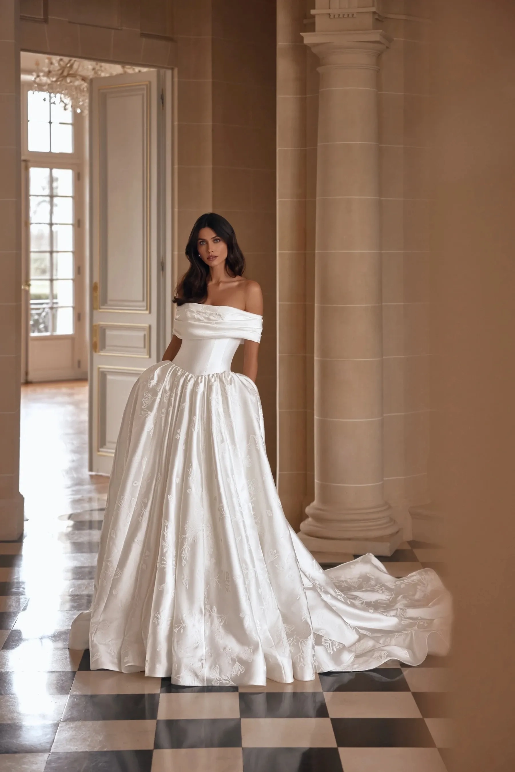 A voluminous mikado gown in Ivory combining classic elegance with delicate embroidery texture. The sweetheart neckline corset shapes a harmonious waist, while the slightly concave back below the shoulder blades adds softness to the silhouette. A concealed central back zipper ensures a perfect fit. The full skirt in mikado fabric features textured embroidery and gathers along the seam, with a long train adding grandeur. The skirt seam elegantly follows the corset’s curves, accentuating the silhouette. A removable bolero, 3462B, with mikado draping and central back closure with lacing completes the refined ensemble.