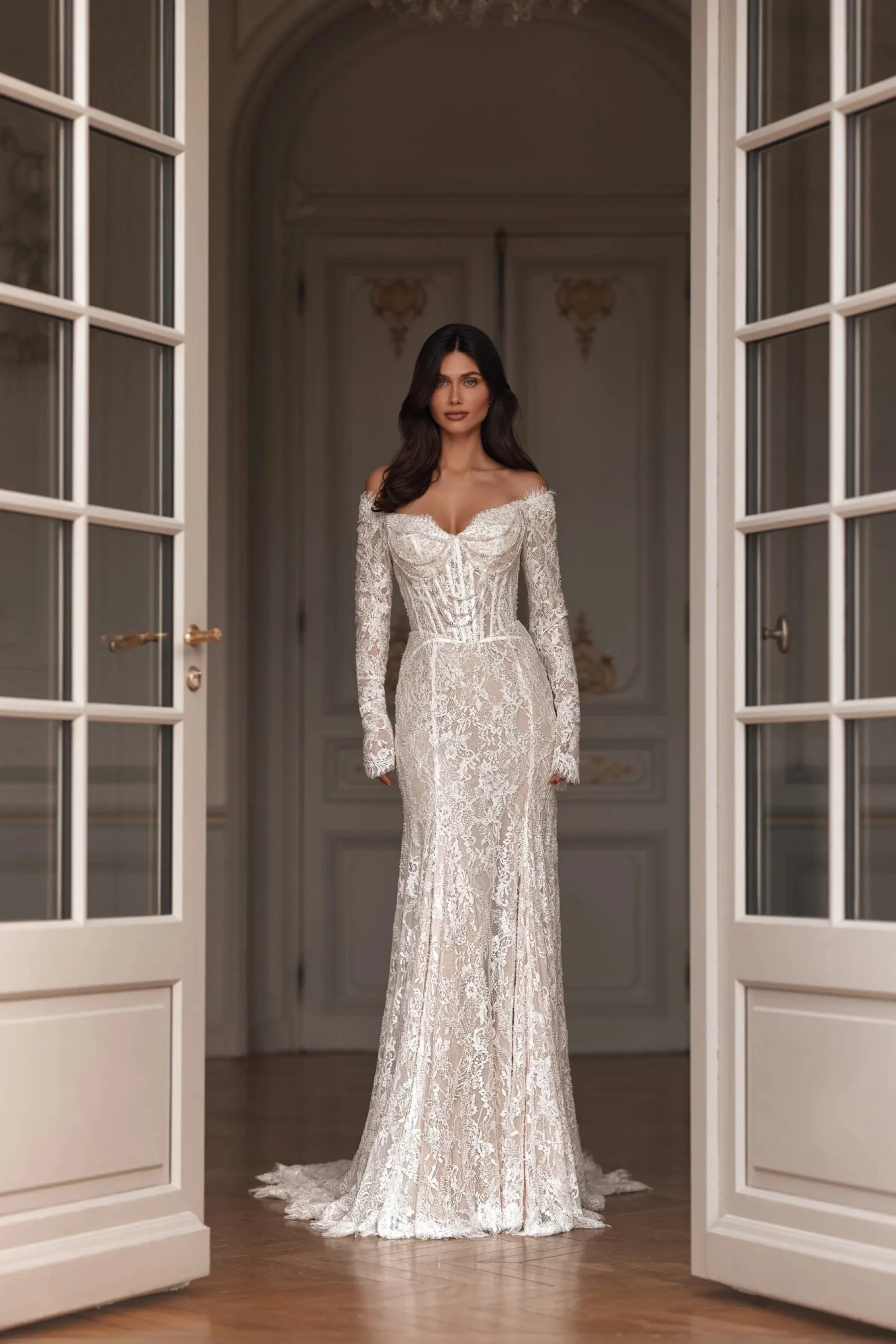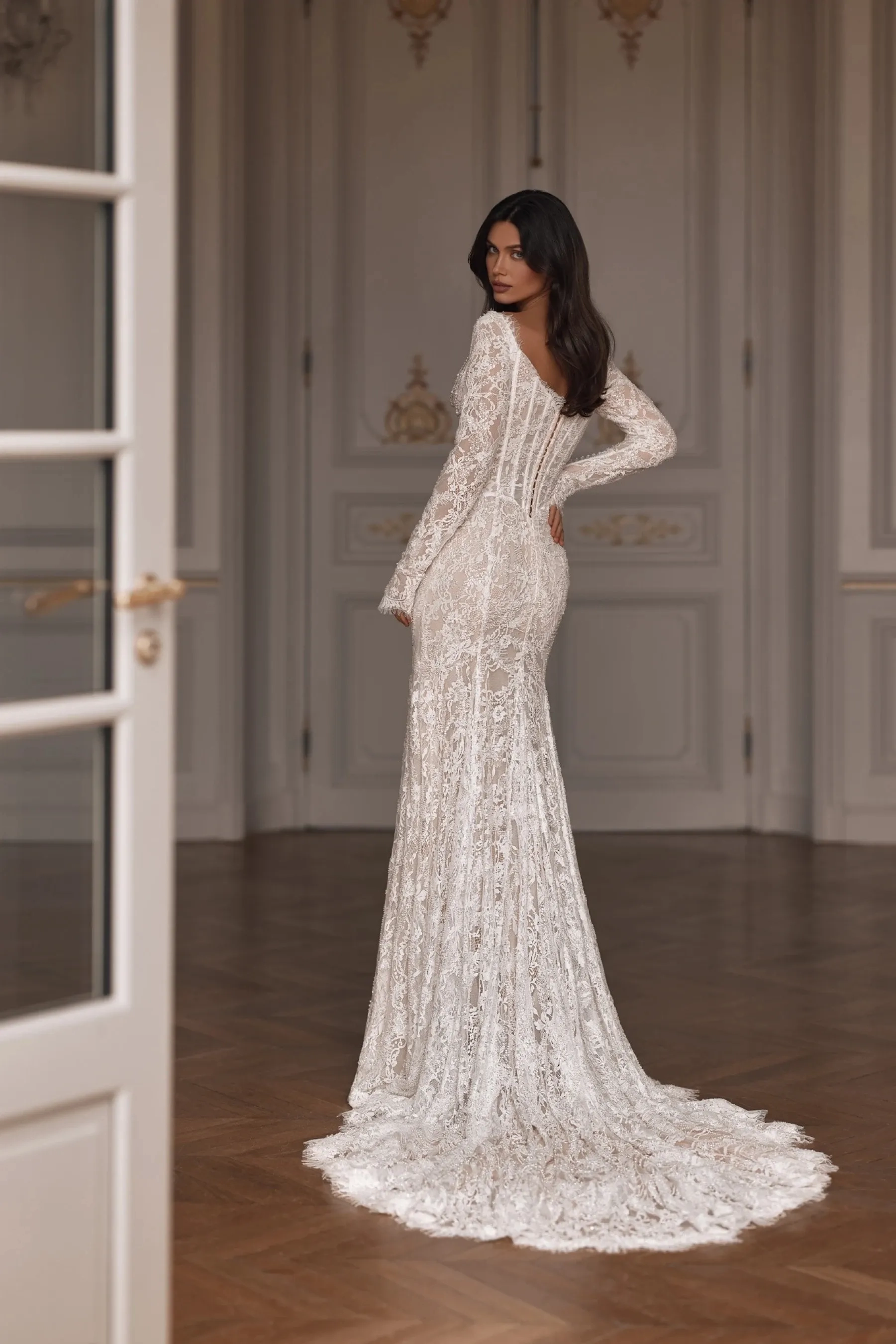 A mermaid silhouette gown in light skin with a semi-sheer “swan” corset flowing onto the forearms as a long lace sleeve. The bodice is decorated with hand embroidery and satin strips that emphasize the structural lines. The slightly V-shaped back below the shoulder blades with hook-and-eye closures creates an elegant silhouette. The fitted embroidered lace skirt with a train and shaped seam, accented with satin strips, highlights graceful movement. A lined version and Ivory color option are available.