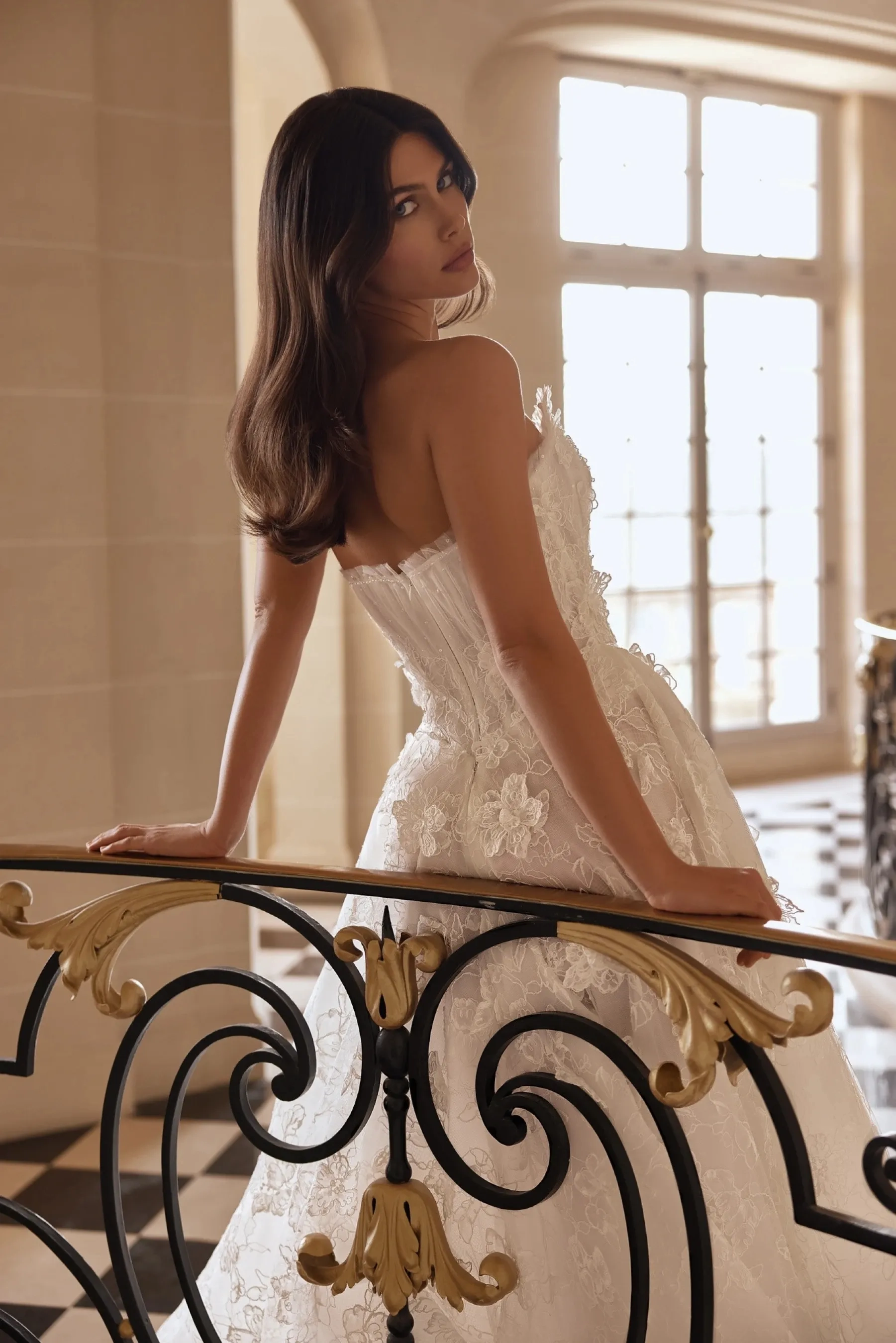 An A-line Ivory gown combining lightness of fabric with rich decorative details. The semi-sheer boat-neck corset features a central nude mesh insert softly framing the bust. The slightly concave back below the shoulder blades with concealed zipper enhances grace and flow. Vertical mesh draping on the corset forms a ruffle at the top edge, while 3D appliqués and hand embroidery create an elegant layered texture. The full skirt with a train has a lace top layer adorned with 3D appliqués. The shaped seam mirrors the bodice silhouette for a complete, harmonious look. A central concealed back zipper ensures perfect fit. Lined option available.
