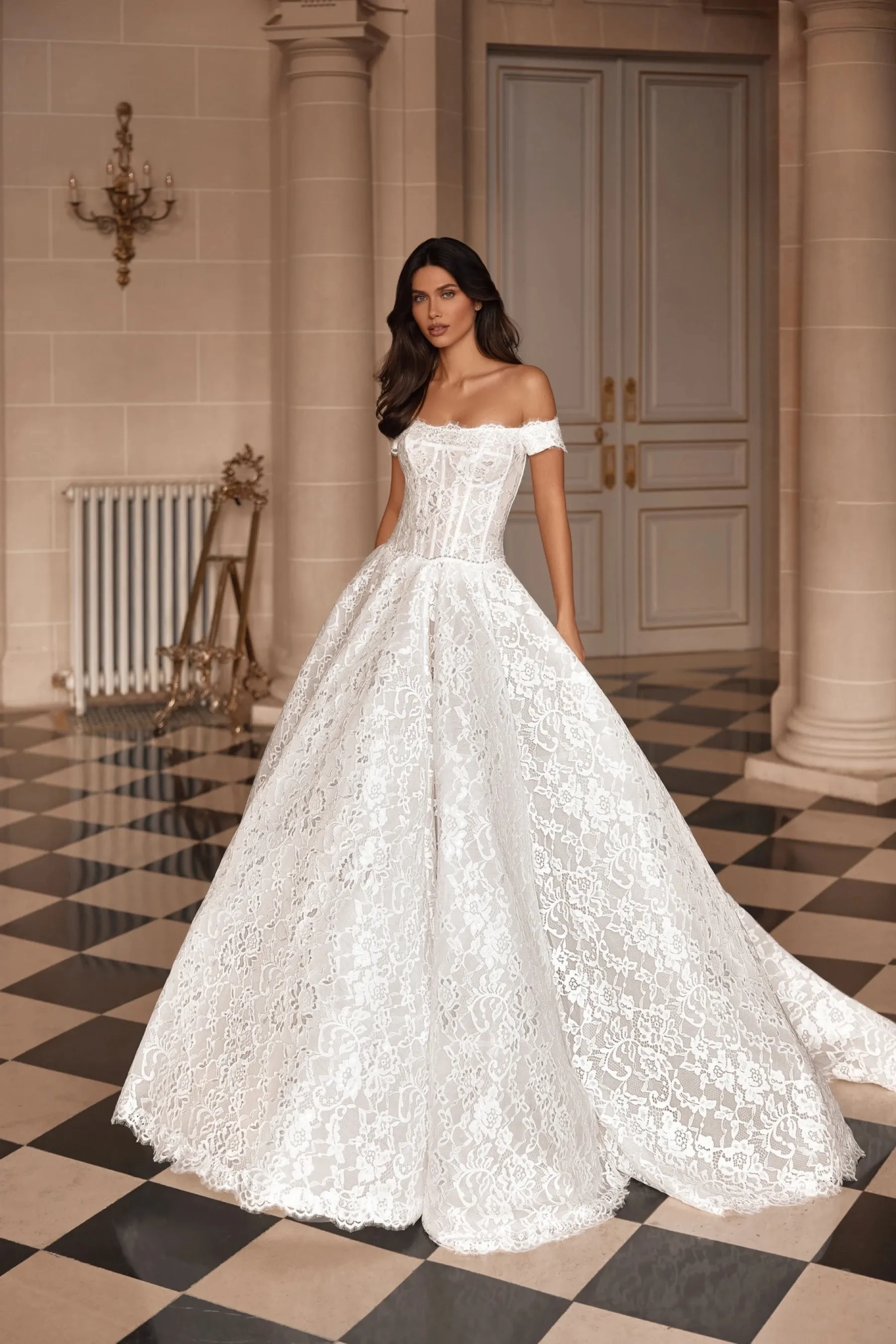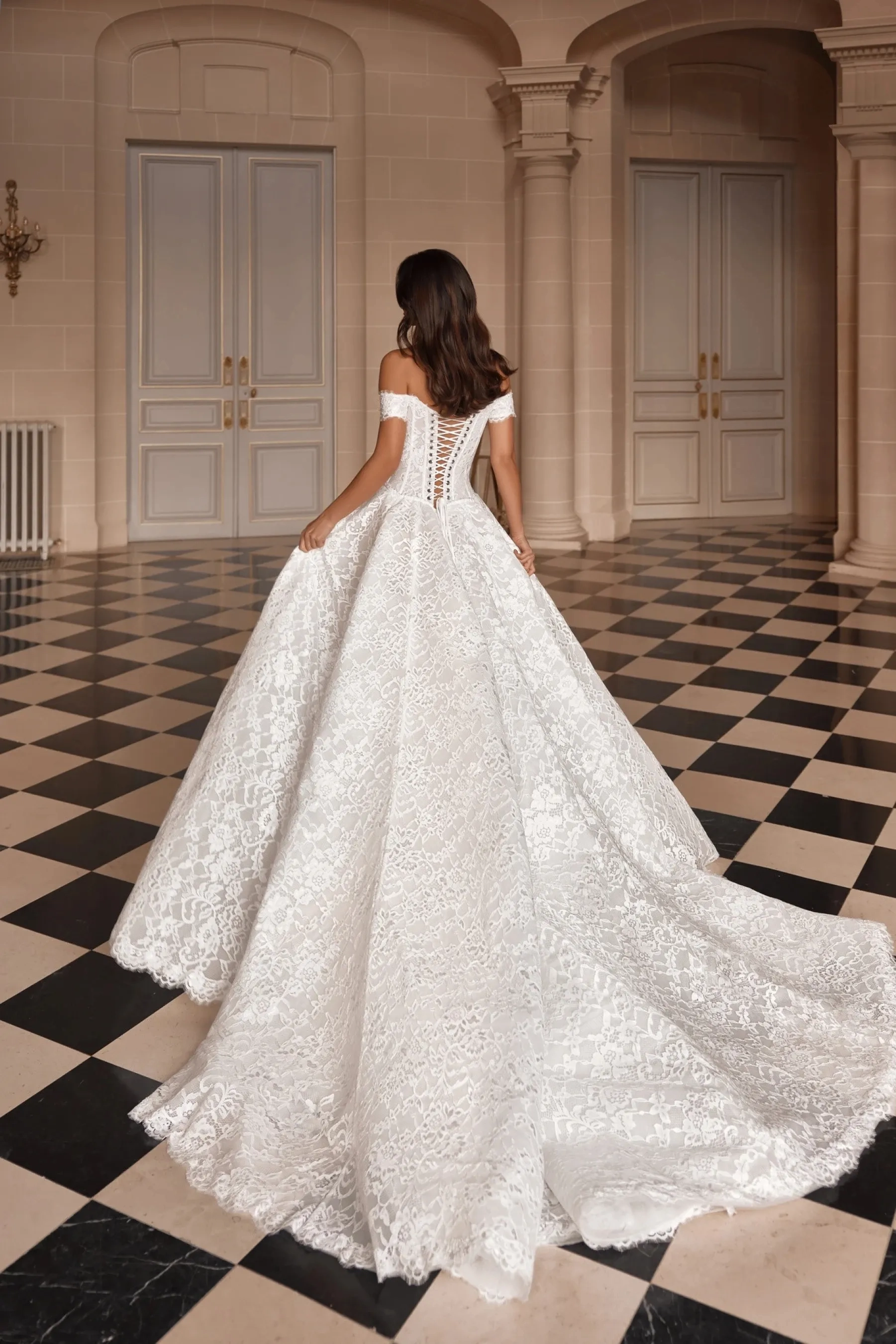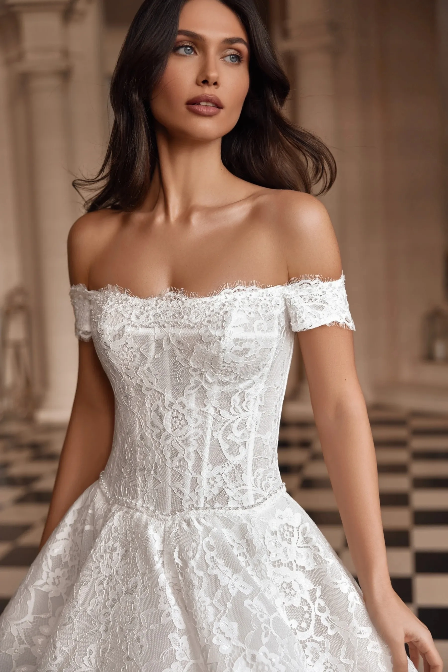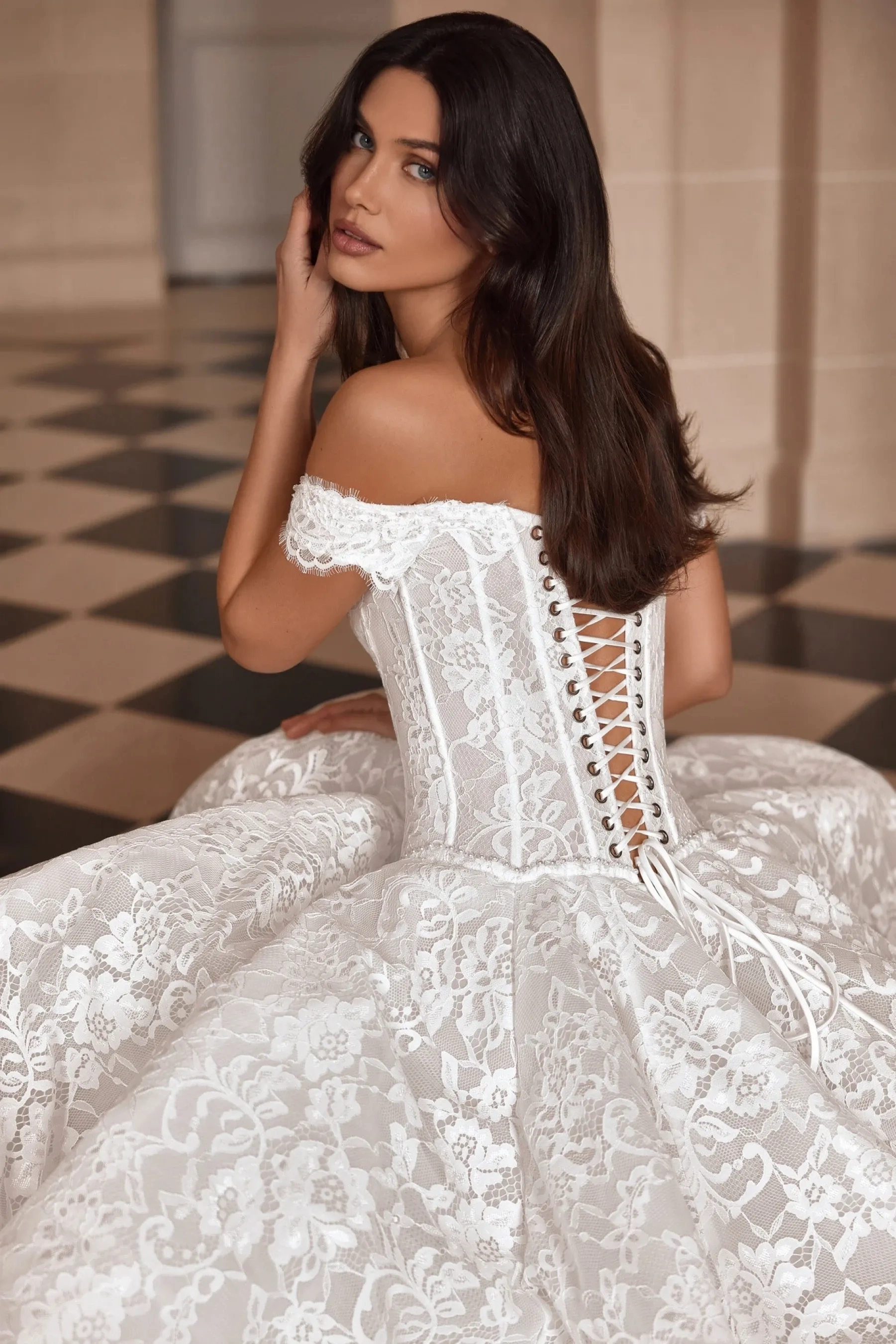 A voluminous Ivory gown that harmoniously combines lightness with luxurious fullness. The semi-sheer straight-neck corset with short sleeves is decorated with rigilene, emphasizing construction lines and architectural precision. The slightly concave back with eyelets and lacing creates a refined curve, while hand embroidery at the top adds shimmer and textural depth. The full lace skirt with a train mirrors the corset’s curved lines at the top edge. Hand embroidery with pearls along the seam adds delicate sparkle and intricate detail. A central concealed back zipper ensures perfect fit. Lined and concealed zipper options available.