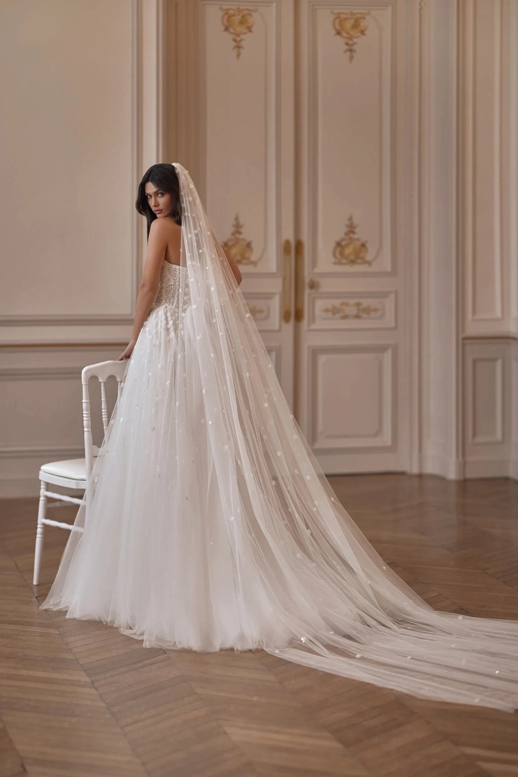An A-line gown in Ivory with incredible airy volume. The semi-sheer embroidered lace corset features a delicate boat neckline and a slightly concave back below the shoulder blades, covering the waist and emphasizing graceful lines. A concealed central back zipper is complemented by loops for a full tulle lacing, creating a light corset structure. The full skirt, made of layers of tulle with inserted panels and appliqués, forms harmonious volume. The shaped seam of the skirt is highlighted with embroidery. The look is completed with 3466SL sleeves: a voluminous tulle outer layer and a fitted lace inner layer, creating a charming dimensional effect.