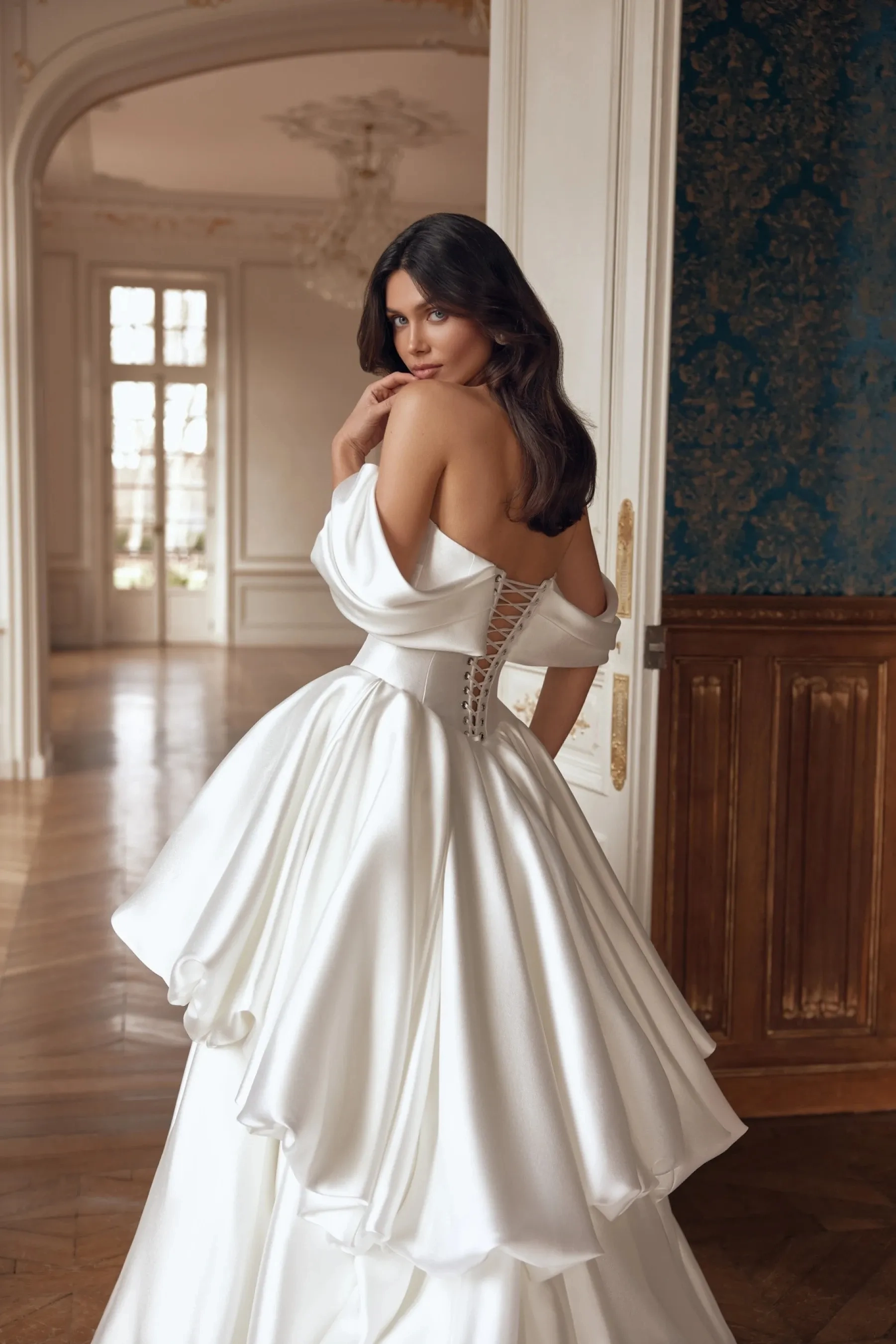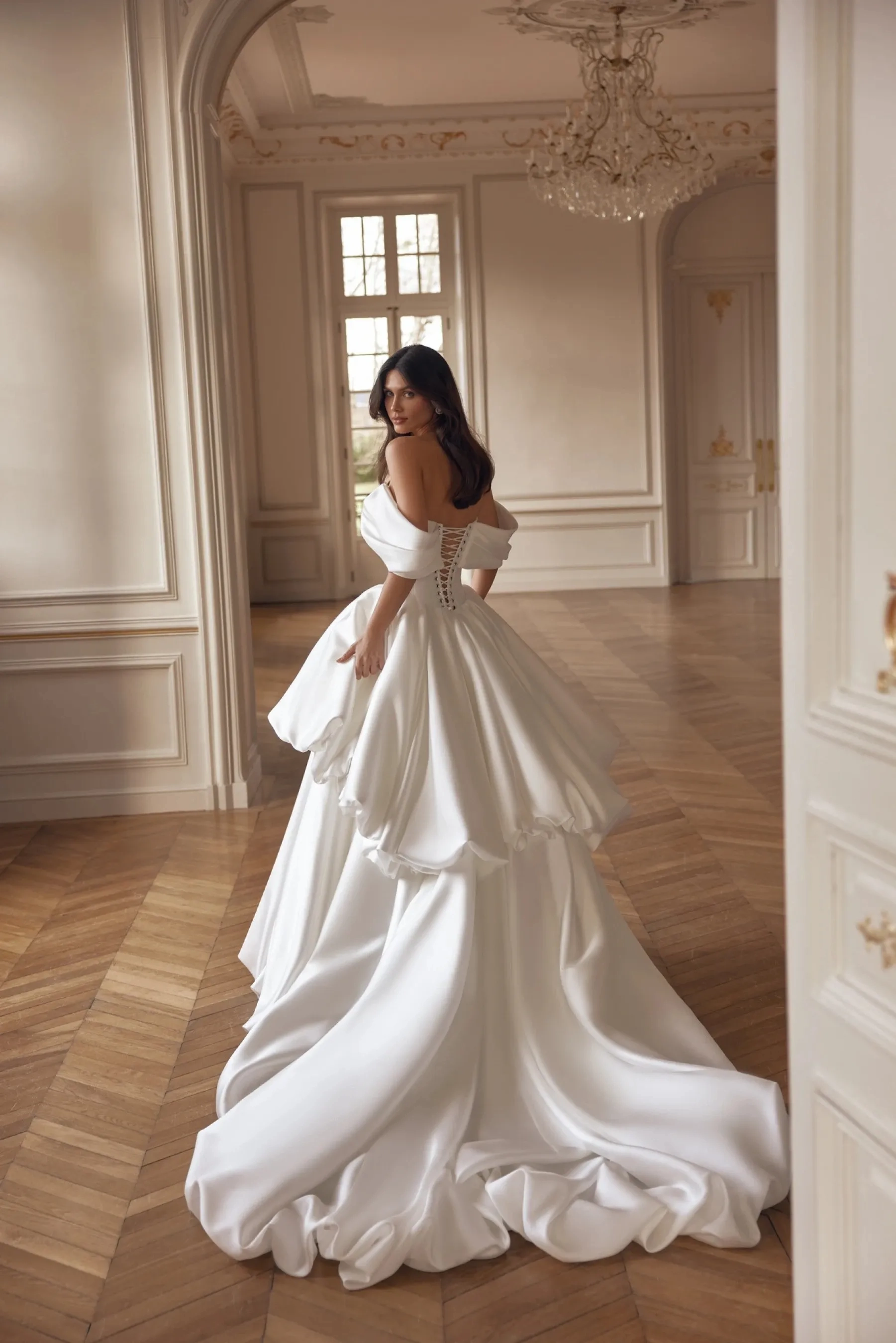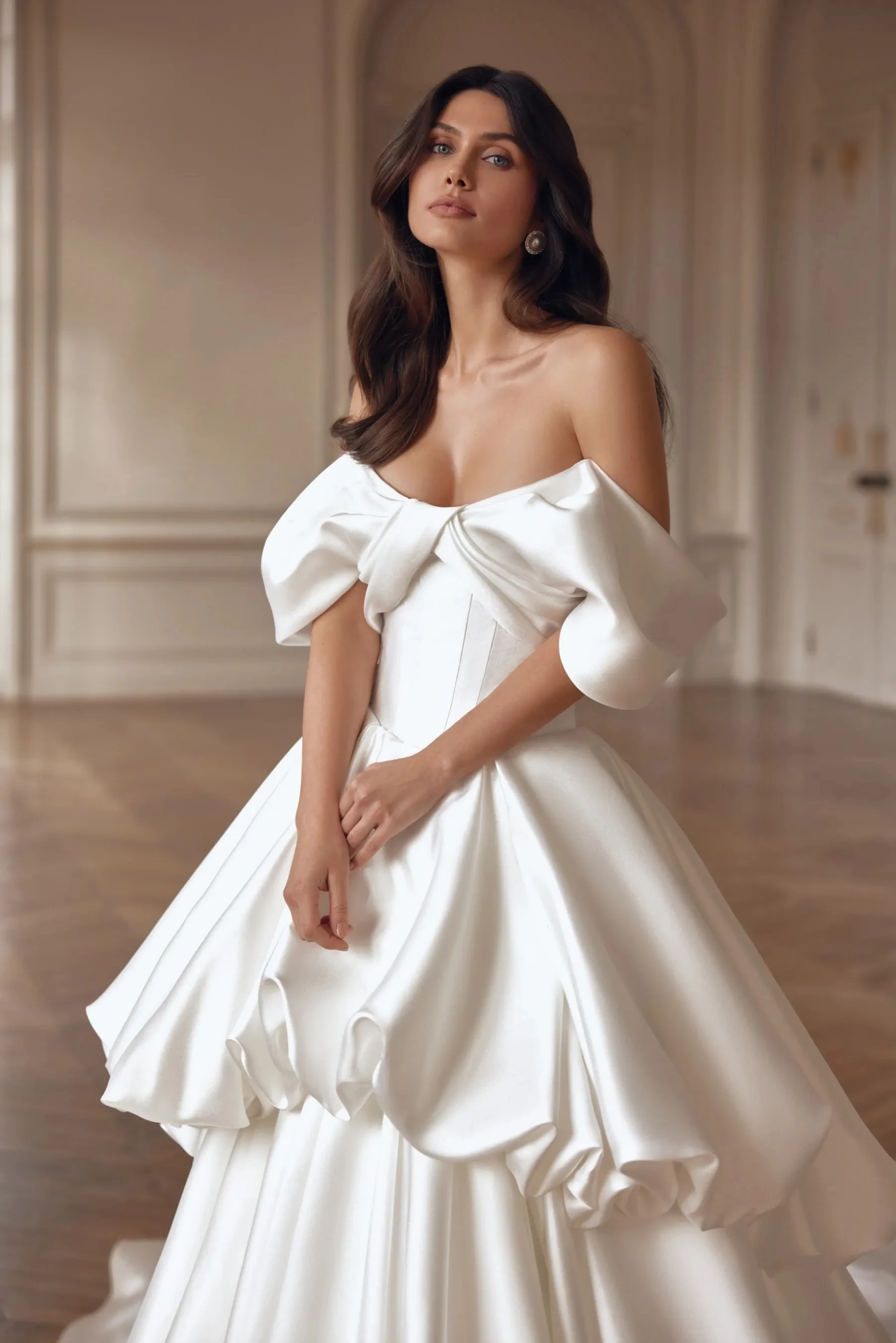 Majestic yet refined, this voluminous gown in noble mikado fabric in Ivory creates the look of a modern princess. The corset with an elegant boat neckline features a lowered seam at the skirt attachment, emphasizing the waist and forming a flawless silhouette. Draping from the main fabric gently wraps the bodice and flows onto the forearms, creating delicate short sleeves that add softness and nobility. The slightly concave back with lacing highlights graceful posture, while the draped upper part completes a harmonious accent. The full skirt with a train consists of two voluminous gathered tiers, creating luxurious volume and a striking bridal walk. A version with a concealed zipper is available.